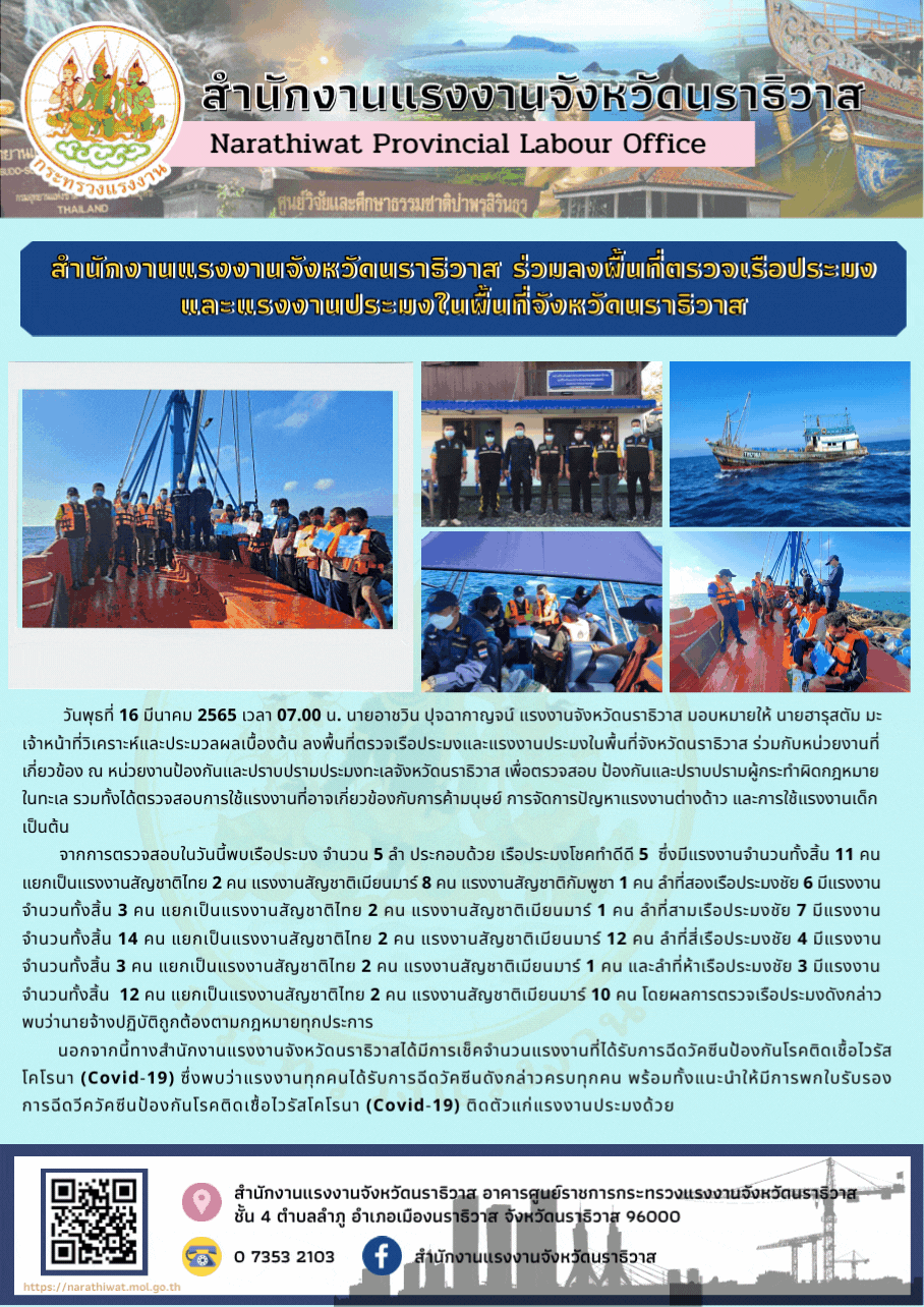 วันพุธที่ 16 มีนาคม 2565 เวลา 07.00 น. นายอาชวิน ปุจฉากาญจน์ แรงงานจังหวัดนราธิวาส มอบหมายให้ นายฮารุสตัม มะ เจ้าหน้าที่วิเคราะห์และประมวลผลเบื้องต้น ลงพื้นที่ตรวจเรือประมงและแรงงานประมงในพื้นที่จังหวัดนราธิวาส ร่วมกับหน่วยงานที่เกี่ยวข้อง ณ หน่วยงานป้องกันและปราบปรามประมงทะเลจังหวัดนราธิวาส เพื่อตรวจสอบ ป้องกันและปราบปรามผู้กระทำผิดกฎหมายในทะเล รวมทั้งได้ตรวจสอบการใช้แรงงานที่อาจเกี่ยวข้องกับการค้ามนุษย์ การจัดการปัญหาแรงงานต่างด้าว และการใช้แรงงานเด็ก เป็นต้น