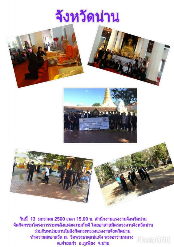 เมื่อวันที่ 13 มกราคม 2560 เวลา 15.00 น. สำนักงานแรงงานจังหวัดน่าน จัดโครงการรวมพลังแห่งความภัคดี โดยอาสาสมัครแรงงานจังหวัดน่าน เพื่อถวายเป็นพระราชกุศลแด่พระบาทสมเด็จพระเจ้าอยู่หัวพระปรมินทรมหาภูมิพลอดุลยเดช โดยร่วมกันบำเพ็ญกุศลทางศาสนาและทำความสะอาดห้องน้ำวัดพระธาตุแช่แห้งพระอารามหลวง ณ วัดพระธาตุแช่แห้งพระอารามหลวง ต.ฝายแก้ว อ.ภูเพียง จ.น่าน