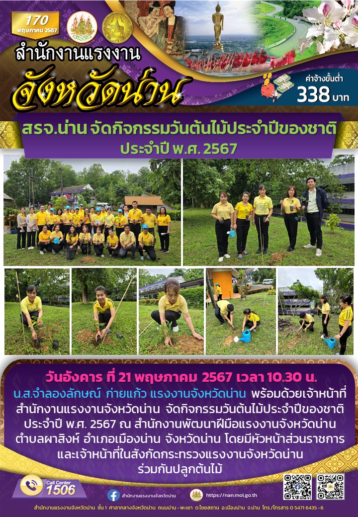 น.ส.จำลองลักษณ์ ก่ายแก้ว แรงงานจังหวัดน่าน พร้อมด้วยเจ้าหน้าที่สำนักงานแรงงานจังหวัดน่าน จัดกิจกรรมวันต้นไม้ประจำปีของชาติ ประจำปี พ.ศ. 2567 ณ สำนักงานพัฒนาฝีมือแรงงานจังหวัดน่าน ตำบลผาสิงห์ อำเภอเมืองน่าน จังหวัดน่าน โดยมีหัวหน้าส่วนราชการและเจ้าหน้าที่ในสังกัดกระทรวงแรงงานจังหวัดน่านร่วมกันปลูกต้นไม้