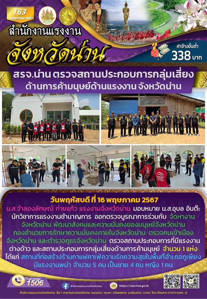 น.ส.จำลองลักษณ์ ก่ายแก้ว แรงงานจังหวัดน่าน มอบหมาย น.ส.อุบล อินต๊ะ นักวิชาการแรงงานชำนาญการ ออกตรวจบูรณาการร่วมกับ จัดหางานจังหวัดน่าน พัฒนาสังคมและความมั่นคงของมนุษย์จังหวัดน่าน กองอำนวยการรักษาความมั่นคงภายในจังหวัดน่าน ตรวจคนเข้าเมืองจังหวัดน่าน และตำรวจภูธรจังหวัดน่าน ตรวจสถานประกอบการที่มีแรงงานต่างด้าว และสถานประกอบการกลุ่มเสี่ยงด้านการค้ามนุษย์ จำนวน 1 แห่ง ได้แก่ สถานที่ก่อสร้างร้านกาแฟคาเฟ่ความรักความสุขในพื้นที่อำเภอภูเพียง มีแรงงานพม่า จำนวน 5 คน เป็นชาย 4 คน หญิง 1 คน