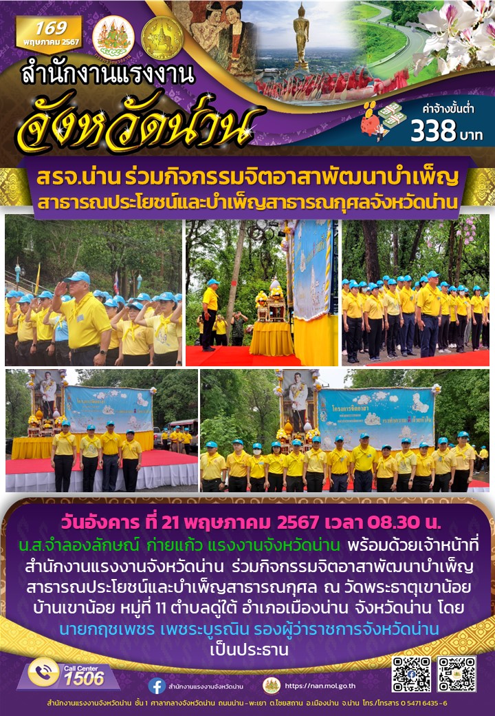 น.ส.จำลองลักษณ์ ก่ายแก้ว แรงงานจังหวัดน่าน พร้อมด้วยเจ้าหน้าที่สำนักงานแรงงานจังหวัดน่าน ร่วมกิจกรรมจิตอาสาพัฒนาบำเพ็ญสาธารณประโยชน์และบำเพ็ญสาธารณกุศล ณ วัดพระธาตุเขาน้อย บ้านเขาน้อย หมู่ที่ 11 ตำบลดู่ใต้ อำเภอเมืองน่าน จังหวัดน่าน โดย นายกฤชเพชร เพชระบูรณิน รองผู้ว่าราชการจังหวัดน่าน เป็นประธาน