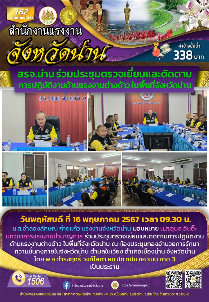 น.ส.จำลองลักษณ์ ก่ายแก้ว แรงงานจังหวัดน่าน มอบหมาย น.ส.อุบล อินต๊ะ นักวิชาการแรงงานชำนาญการ ร่วมประชุมตรวจเยี่ยมและติดตามการปฏิบัติงานด้านแรงงานต่างด้าว ในพื้นที่จังหวัดน่าน ณ ห้องประชุมกองอำนวยการรักษาความมั่นคงภายในจังหวัดน่าน ตำบลในเวียง อำเภอเมืองน่าน จังหวัดน่าน โดย พ.อ.ดำรงฤทธิ์ วงศ์โสภา หน.ปท.ศปม.กอ.รมน.ภาค 3 เป็นประธาน