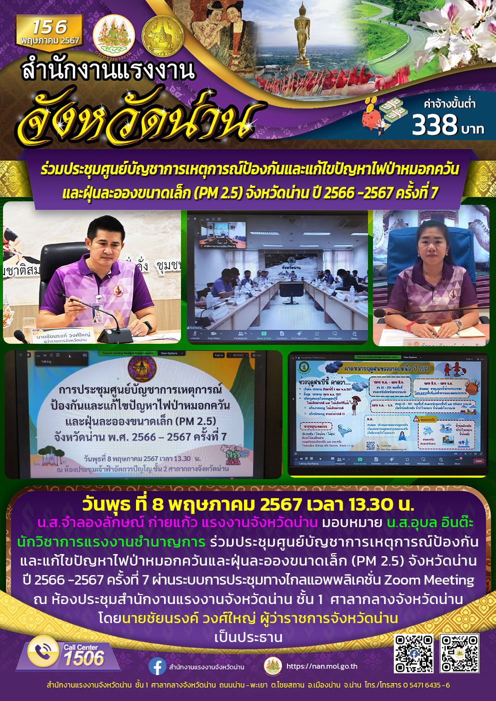 น.ส.จำลองลักษณ์ ก่ายแก้ว แรงงานจังหวัดน่าน มอบหมาย น.ส.อุบล อินต๊ะ นักวิชาการแรงงานชำนาญการ ร่วมประชุมศูนย์บัญชาการเหตุการณ์ป้องกันและแก้ไขปัญหาไฟป่าหมอกควันและฝุ่นละอองขนาดเล็ก (PM 2.5) จังหวัดน่าน ปี 2566 -2567 ครั้งที่ 7 ผ่านระบบการประชุมทางไกลแอพพลิเคชั่น Zoom Meeting ณ ห้องประชุมสำนักงานแรงงานจังหวัดน่าน ชั้น 1 ศาลากลางจังหวัดน่าน โดยนายชัยนรงค์ วงศ์ใหญ่ ผู้ว่าราชการจังหวัดน่าน เป็นประธาน