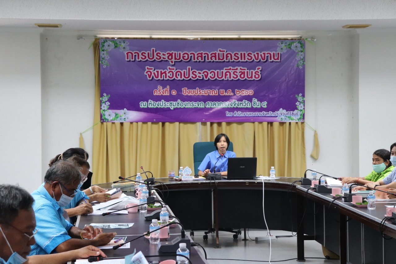 สำนักงานแรงงานจังหวัดประจวบคีรีขันธ์ จัดการประชุมอาสาสมัครแรงงานจังหวัดประจวบคีรีขันธ์ เมื่อวันที่ 9 กันยายน 2563 โดยนางสาวยุพิน มูลจันทะ แรงงานจังหวัดประจวบคีรีขันธ์ มอบหมายให้ นางสาวมยุรี อินต๊ะมา นักวิชาการแรงงานชำนาญการ เป็นประธาน ทั้งนี้เพื่อนำเสนอผลการประเมินโครงการแก้ไขปัญหาความเดือดร้อนด้านอาชีพ ประจำปีงบประมาณ พ.ศ. 2562 และสรุปผลการปฏิบัติงานอาสาสมัครแรงงาน ประจำปีงบประมาณ พ.ศ.2563 โดยมีพี่เลี้ยงอาสาสมัครแรงงานจากหน่วยงานสังกัดกระทรวงแรงงานจังหวัดประจวบคีรีขันธ์ พร้อมด้วยอาสาสมัครแรงงานจังหวัดประจวบคีรีขันธ์ เข้าร่วมประชุมทั้งสิ้น 60 คน ณ ห้องประชุมช่องกระจก ศาลากลางจังหวัด ชั้น 4 ศาลากลางจังหวัดประจวบคีรีขันธ์