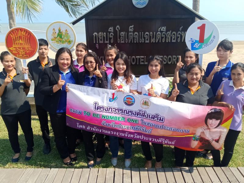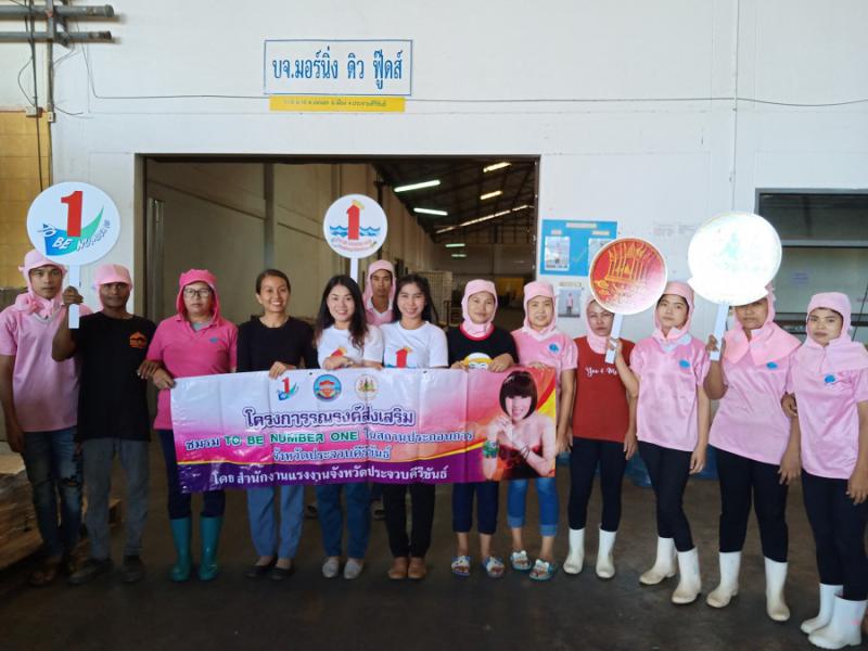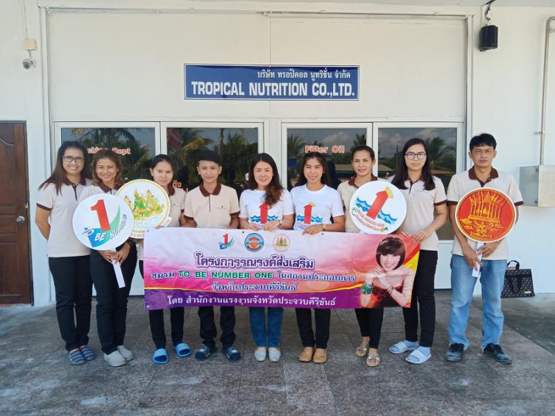 วันที่ 12 กุมภาพันธ์ 2562 นางสาวอังคณา คงศักดิ์ นักวิชาการแรงงานชำนาญการ พร้อมด้วย นางสาวพรรณราย ปานเล็ก นักวิชาการแรงงาน เข้ารณรงค์ส่งเสริมการจัดตั้งชมรม TO BE NUMBER ONE ในสถานประกอบการ ประจำปี พ.ศ. 2562 ในพื้นที่อำเภอเมือง จังหวัดประจวบคีรีขันธ์ จำนวน 4 แห่ง ได้แก่ (1)บริษัท ทรอปิคอล นูทริชั่น จำกัด (2)บริษัท สวอน อินดัสทรีส์ (ประเทศไทย) จำกัด (3)บริษัท มอร์นิ่ง ดิว ฟู๊ดส์ จำกัด (4)บริษัท กุยบุรี โฮเต็ล แอนด์ รีสอร์ท จำกัด ทั้งนี้ เจ้าหน้าที่ได้บรรยายสรุปแนวทางการดำเนินงานตามโครงการฯ ซึ่งผลการรณรงค์ฯ สถานประกอบการส่วนใหญ่ได้ให้ความสนใจเข้าร่วมในการจัดตั้งชมรมฯ