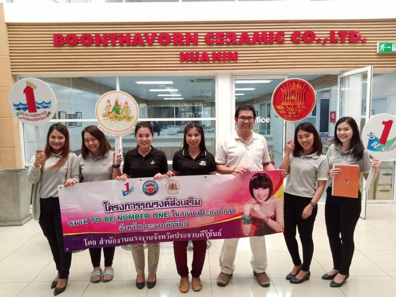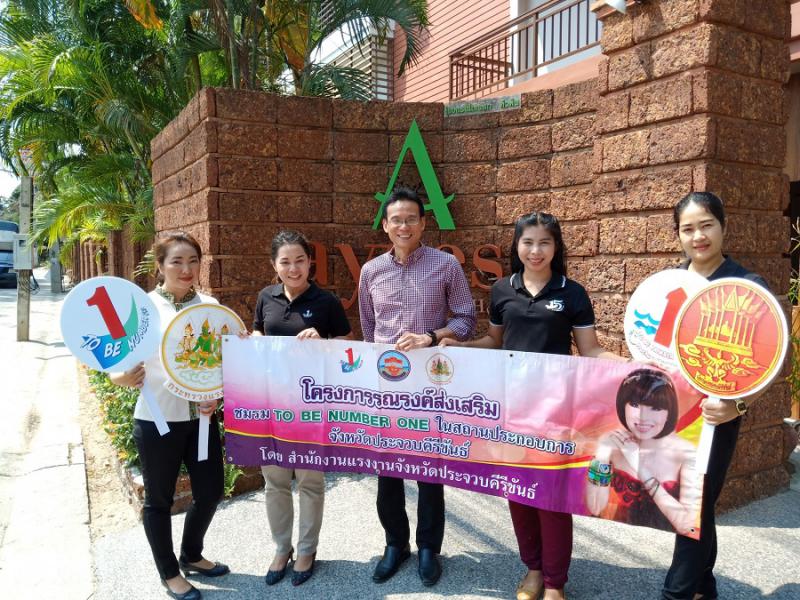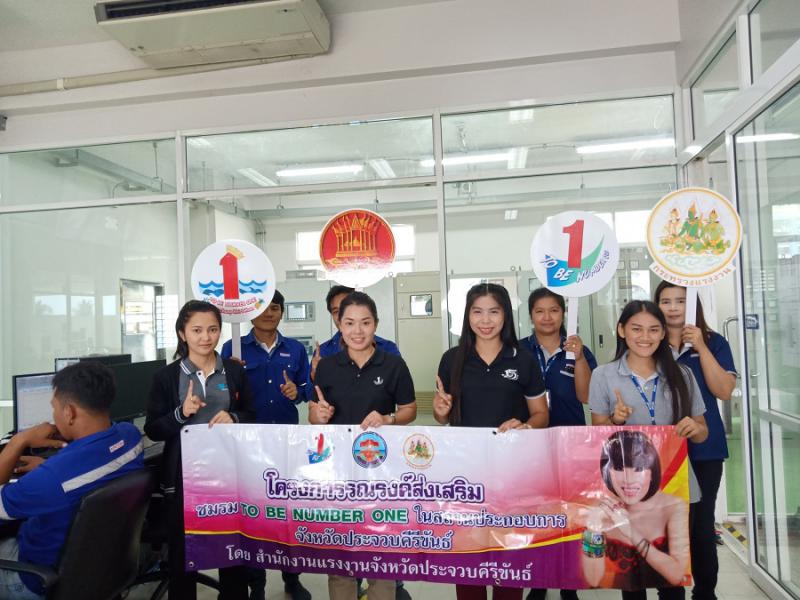 วันที่ 25 กุมภาพันธ์ 2562 นางสาวอังคณา คงศักดิ์ นักวิชาการแรงงานชำนาญการ พร้อมด้วย นางสาวพรรณราย ปานเล็ก นักวิชาการแรงงาน เข้ารณรงค์ส่งเสริมการจัดตั้งชมรม TO BE NUMBER ONE ในสถานประกอบการ ประจำปี พ.ศ. 2562 ในพื้นที่ อ.ทับสะแก และ อ.หัวหิน จ.ประจวบคีรีขันธ์ จำนวน 4 แห่ง ได้แก่