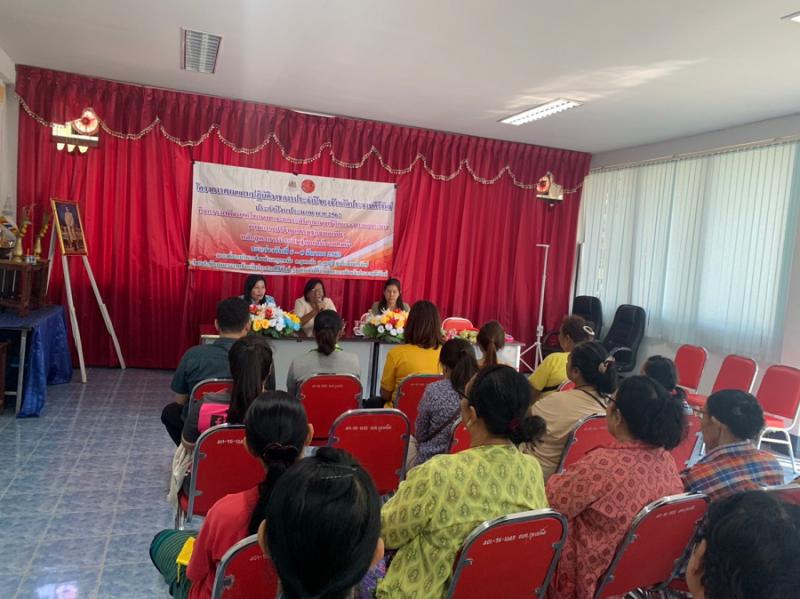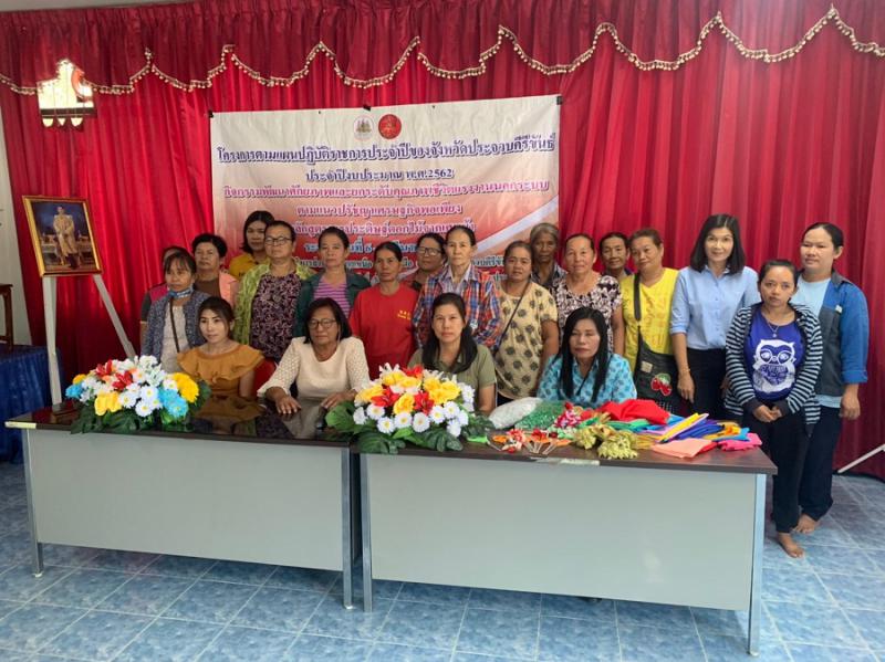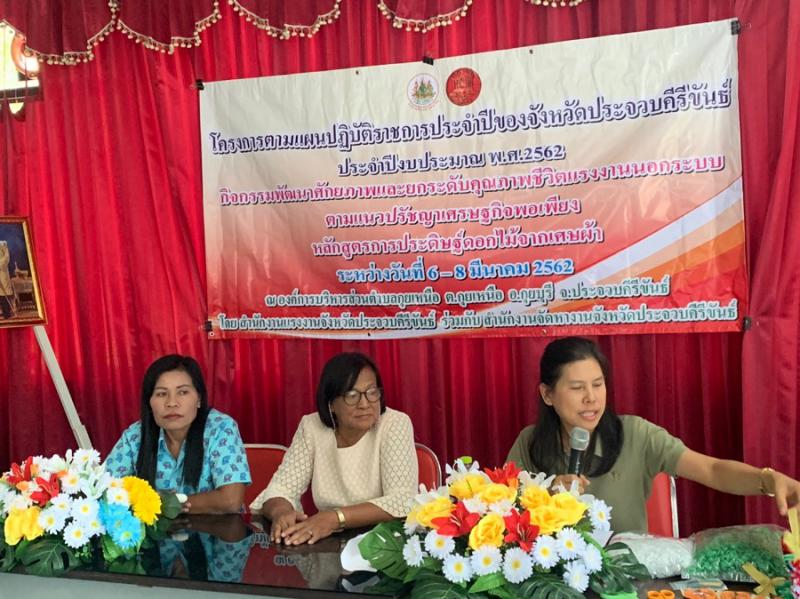 วันที่ 6 มีนาคม 2562 นางสาวมยุรี อินต๊ะมา นักวิชาการแรงงานชำนาญการ รักษาราชการแทนแรงงานจังหวัดประจวบคีรีขันธ์ มอบหมายให้ นางณารีรัตน์ จันทรมณี เจ้าพนักงานการเงินและบัญชีชำนาญการ เปิดฝึกอบรมพัฒนาทักษะฝีมือ ในการประกอบอาชีพแก่กลุ่มแรงงานนอกระบบ ตามโครงการพัฒนาศักยภาพและยกระดับคุณภาพชีวิตแรงงานนอกระบบ ตามแนวปรัชญาเศรษฐกิจพอเพียง จังหวัดประจวบคีรีขันธ์ ประจำปีงบประมาณ 2562 กิจกรรมพัฒนาศักยภาพแรงงานนอกระบบ หลักสูตร “การประดิษฐ์ดอกไม้จากเศษผ้า” ระหว่างวันที่ 6 – 8 มีนาคม 2562 ณ องค์การบริหารส่วนตำบลกุยเหนือ ต.กุยเหนือ อ.กุยบุรี จังหวัดประจวบคีรีขันธ์ ซึ่งได้รับการสนับสนุนงบประมาณค่าใช้จ่ายตามแผนปฏิบัติราชการประจำปีของจังหวัดประจวบคีรีขันธ์ ประจำปีงบประมาณ พ.ศ.2562