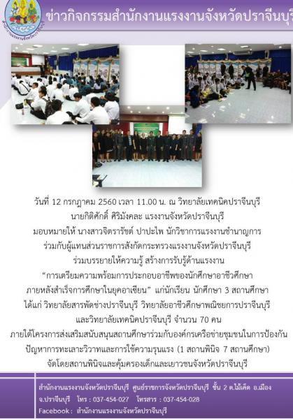นายกิติศักดิ์ ศิริมังคละ แรงงานจังหวัดปราจีนบุรี มอบหมายให้ นางสาวจิตรารัชต์ ปาปะไพ นักวิชาการแรงงานชำนาญการ ร่วมกับผู้แทนส่วนราชการสังกัดกระทรวงแรงงานจังหวัดปราจีนบุรี ร่วมบรรยายให้ความรู้ สร้างการรับรู้ด้านแรงงาน “การเตรียมความพร้อมการประกอบอาชีพของนักศึกษาอาชีวศึกษาภายหลังสำเร็จการศึกาาในยุคอาเซียน"