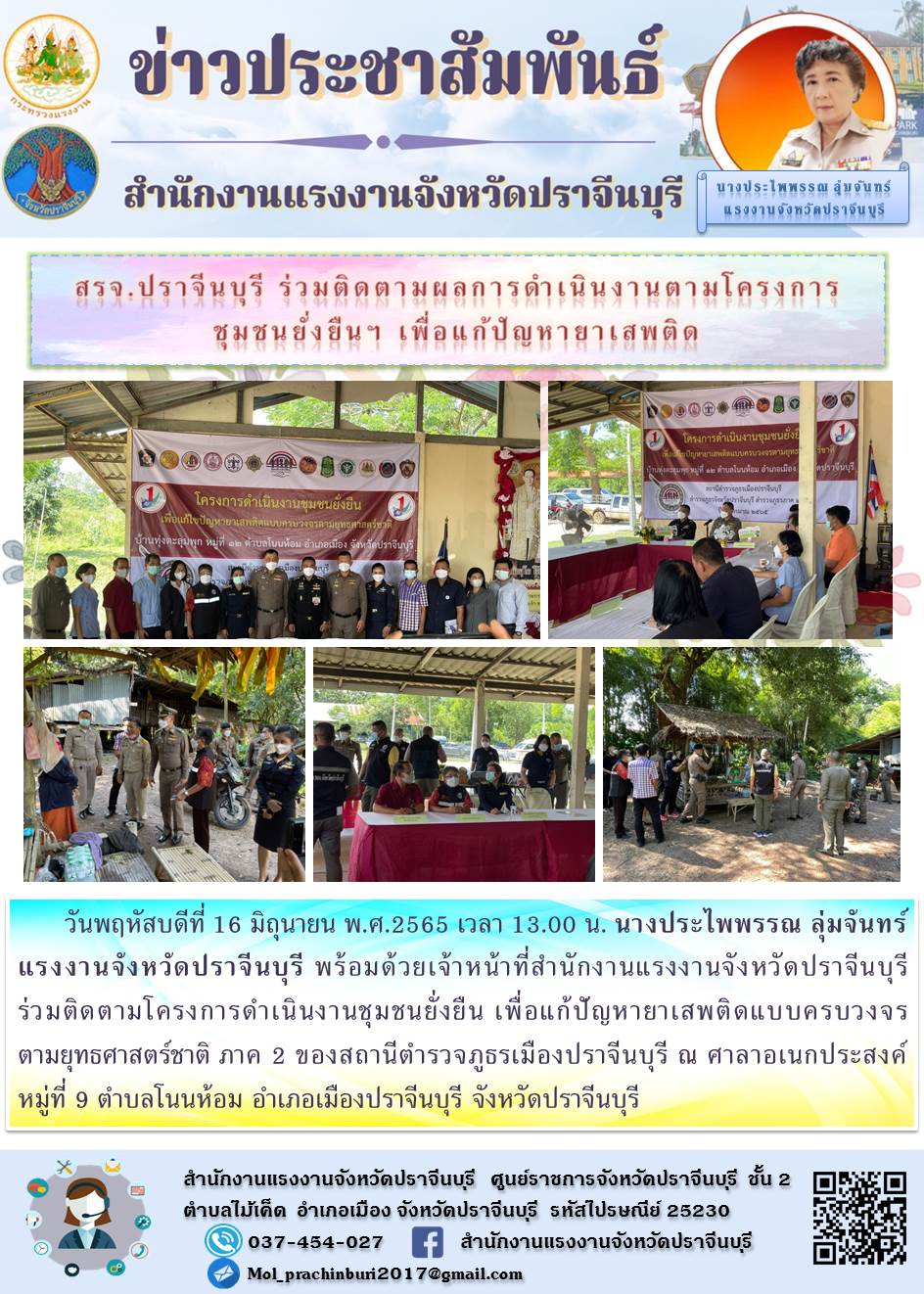 วันพฤหัสบดีที่ 16 มิถุนายน พ.ศ.2565 เวลา 13.00 น. นางประไพพรรณ ลุ่มจันทร์ แรงงานจังหวัดปราจีนบุรี พร้อมด้วยเจ้าหน้าที่สำนักงานแรงงานจังหวัดปราจีนบุรี ร่วมติดตามโครงการดำเนินงานชุมชนยั่งยืน เพื่อแก้ปัญหายาเสพติดแบบครบวงจรตามยุทธศาสตร์ชาติ ภาค 2 ของสถานีตำรวจภูธรเมืองปราจีนบุรี ณ ศาลาอเนกประสงค์ หมู่ที่ 9 ตำบลโนนห้อม อำเภอเมืองปราจีนบุรี จังหวัดปราจีนบุรี