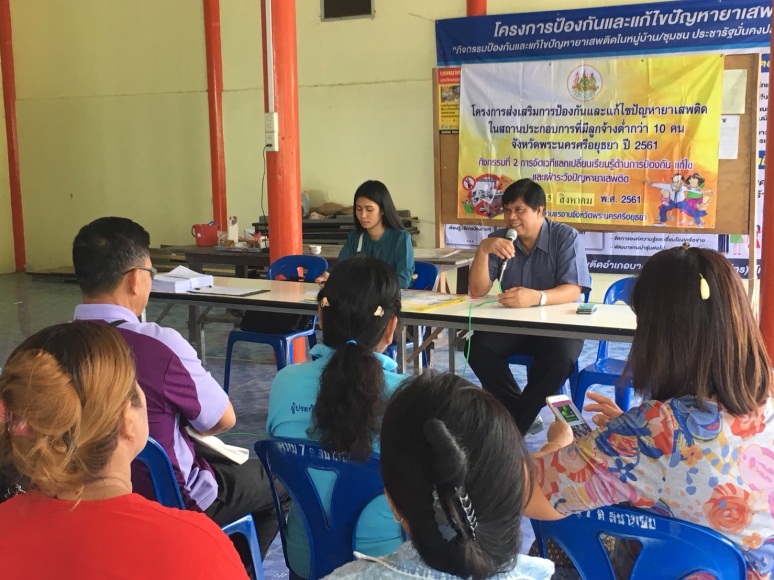 วันพุธที่ 15 สิงหาคม 2561 นายประพนธ์ ศิลปรัศมี แรงงานจังหวัดพระนครศรีอยุธยา ได้ดำเนินการจัดประชุมโครงการส่งเสริมการป้องกันและแก้ไขปัญหายาเสพติดในสถานประกอบการที่มีลูกจ้างต่ำกว่า 10 คน จังหวัดพระนครศรีอยุธยา ปี 2561 กิจกรรมที่ 2 การจัดเวทีแลกเปลี่ยนเรียนรู้ด้านการป้องกัน แก้ไข และเฝ้าระวังปัญหายาเสพติด ณ ศูนย์การเรียนรู้ หมู่ที่ 7 ตำบลสนามชัย อำเภอบางไทร จังหวัดพระนครศรีอยุธยา