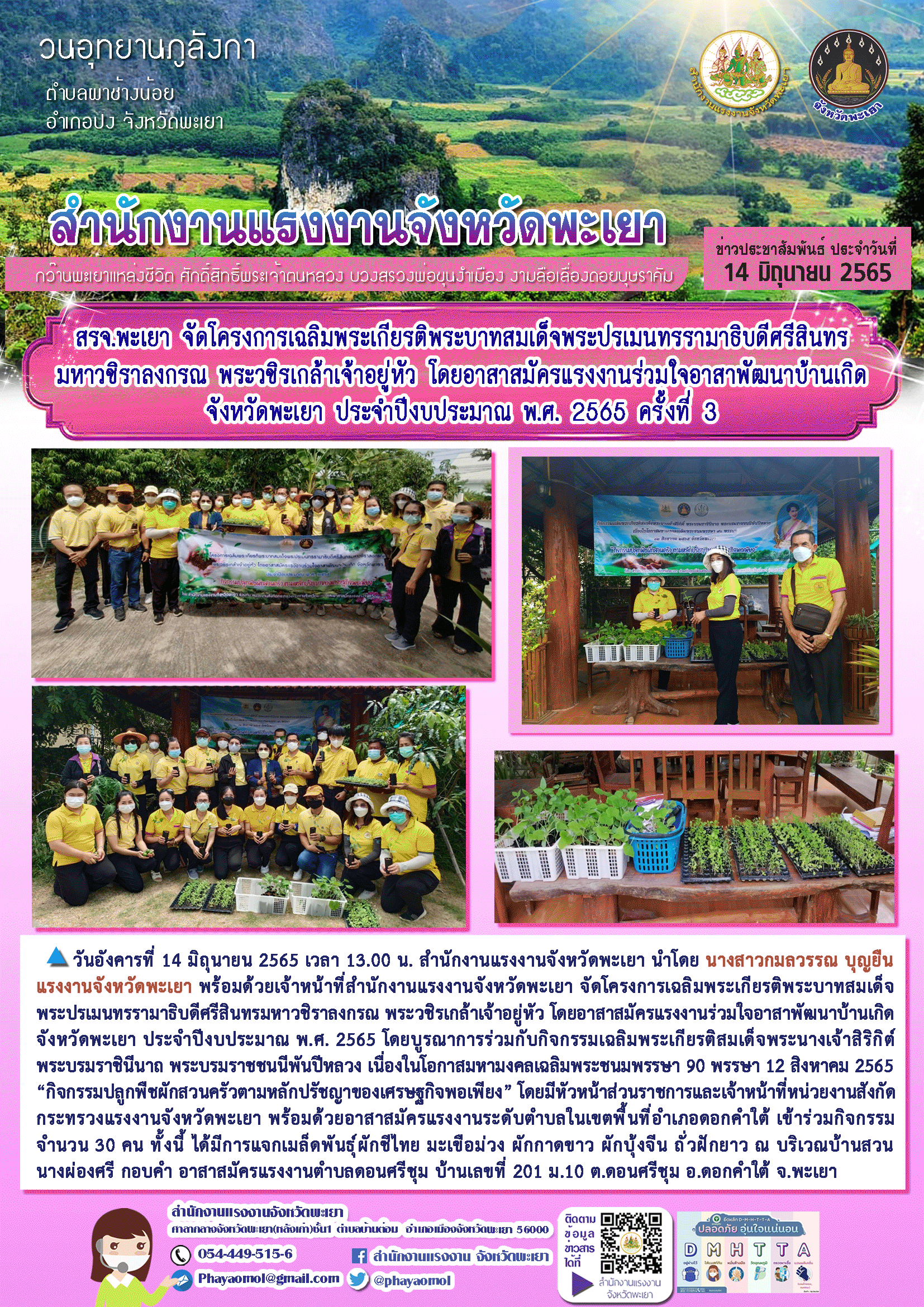 สรจ.พะเยา จัดโครงการเฉลิมพระเกียรติพระบาทสมเด็จพระปรเมนทรรามาธิบดีศรีสินทรมหาวชิราลงกรณ พระวชิรเกล้าเจ้าอยู่หัว โดยอาสาสมัครแรงงานร่วมใจอาสาพัฒนาบ้านเกิด จังหวัดพะเยา ประจำปีงบประมาณ พ.ศ. 2565 ครั้งที่ 3