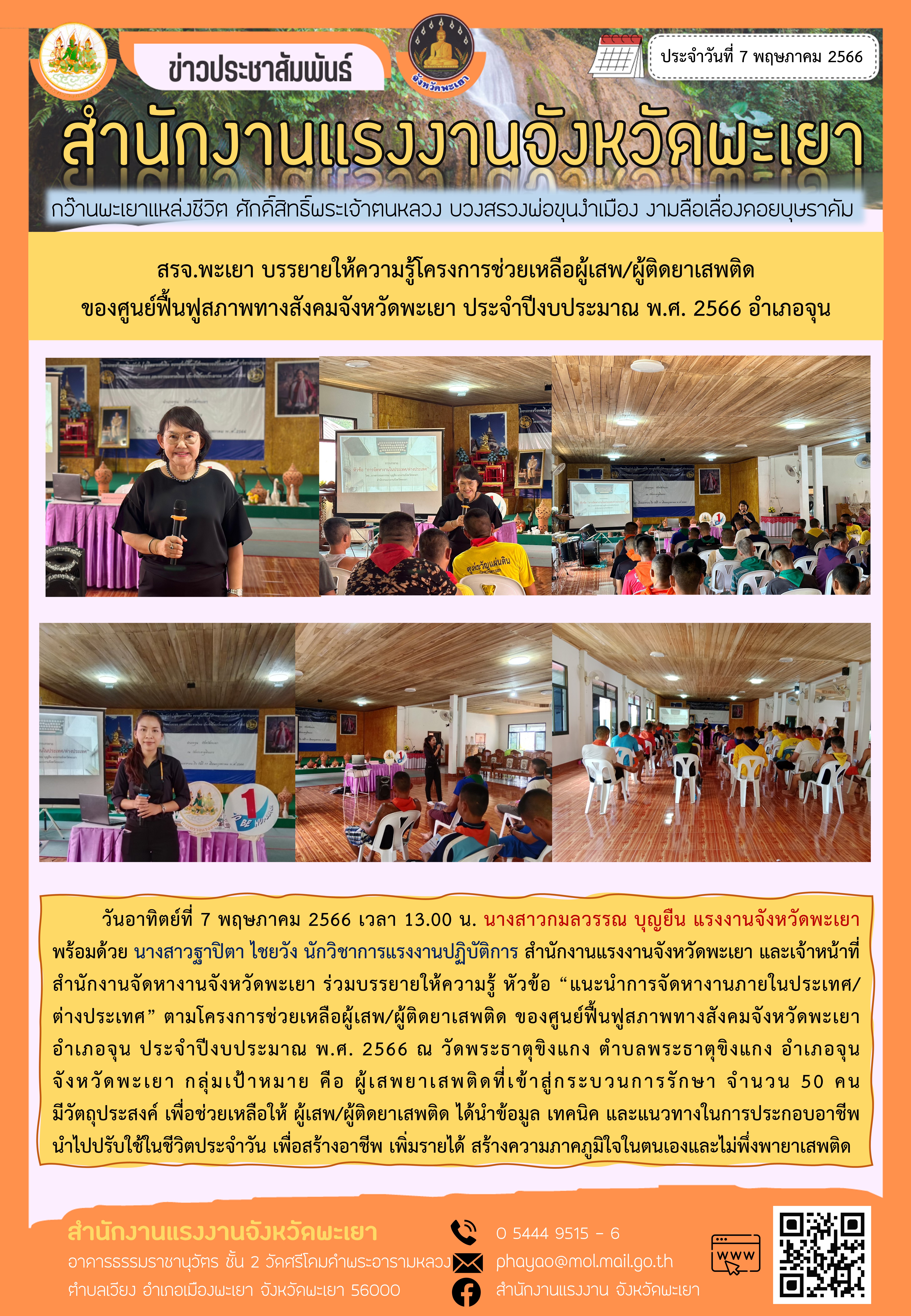 สรจ.พะเยา บรรยายให้ความรู้โครงการช่วยเหลือผู้เสพ/ผู้ติดยาเสพติด ของศูนย์ฟื้นฟูสภาพทางสังคมจังหวัดพะเยา ประจำปีงบประมาณ พ.ศ. 2566 อำเภอจุน