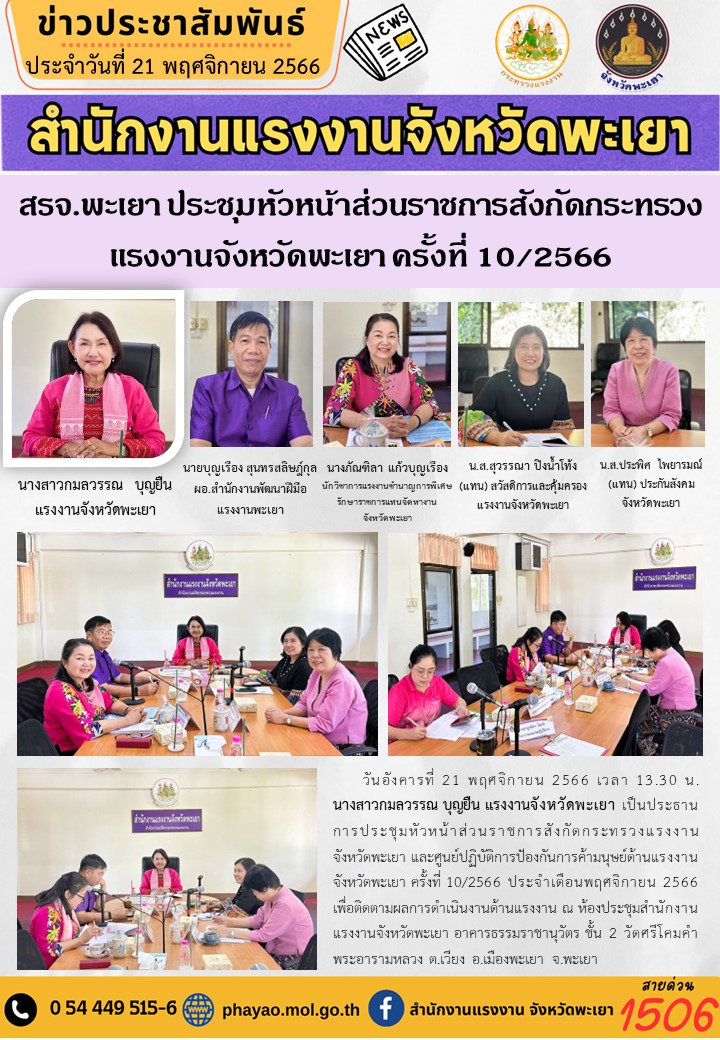 สรจ.พะเยา ประชุมหัวหน้าส่วนราชการสังกัดกระทรวงแรงงานจังหวัดพะเยา ครั้งที่ 10/2566