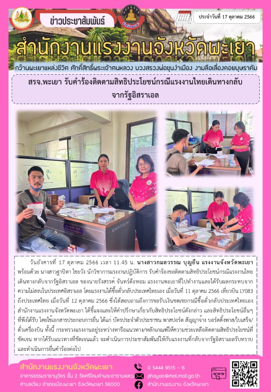 สรจ.พะเยา รับคำร้องติดตามสิทธิประโยชน์กรณีแรงงานไทยเดินทางกลับ จากรัฐอิสราเอล