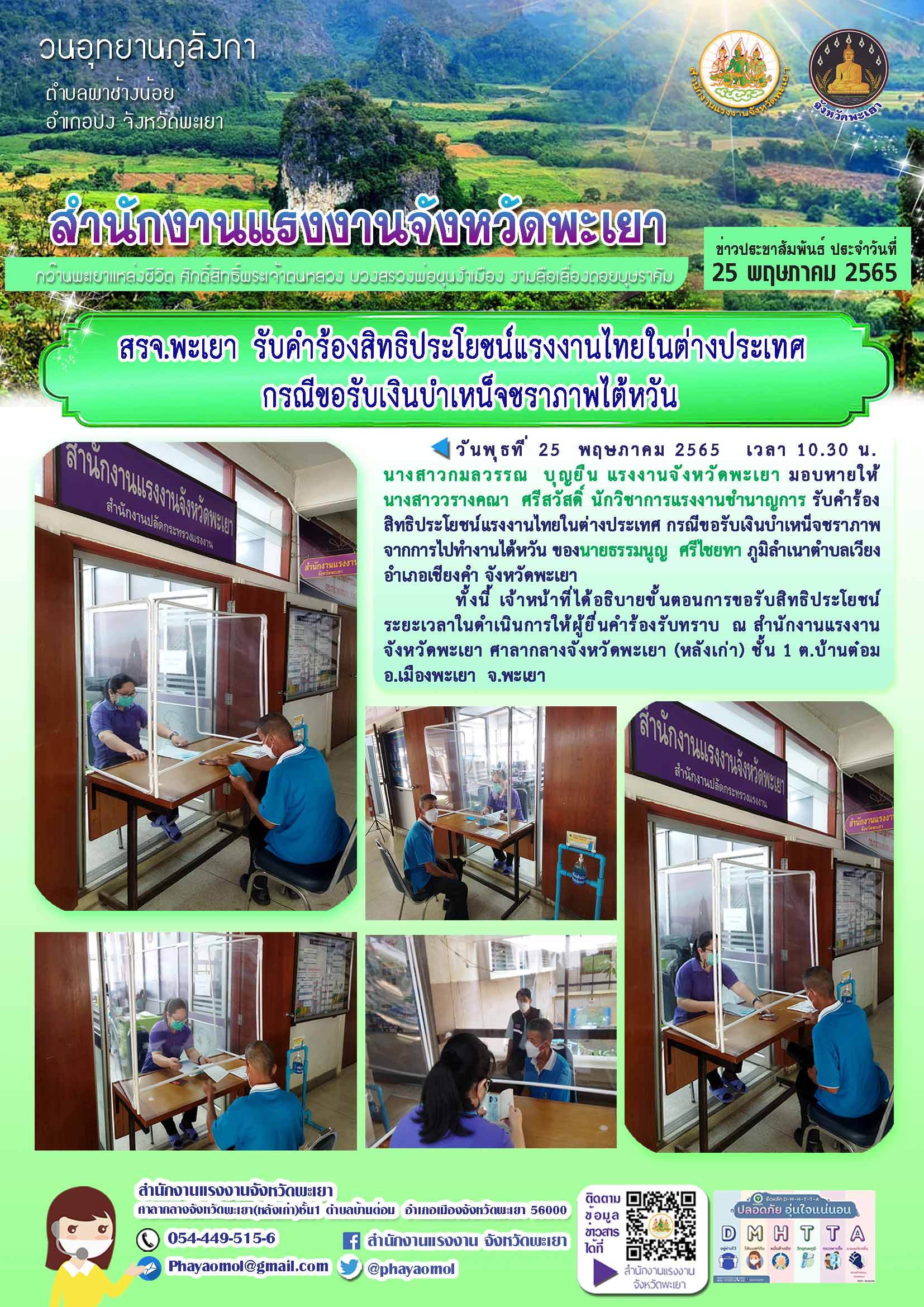 วันพุธที่ 25 พฤษภาคม 2565 เวลา 10.30 น. นางสาวกมลวรรณ บุญยืน แรงงานจังหวัดพะเยา มอบหายให้นางสาววรางคณา ศรีสวัสดิ์ นักวิชาการแรงงานชำนาญการ รับคำร้องสิทธิประโยชน์แรงงานไทยในต่างประเทศ กรณีขอรับเงินบำเหน็จชราภาพจากการไปทำงานไต้หวัน ของนายธรรมนูญ ศรีไชยทา ภูมิลำเนาตำบลเวียง อำเภอเชียงคำ จังหวัดพะเยา ทั้งนี้ เจ้าหน้าที่ได้อธิบายขั้นตอนการขอรับสิทธิประโยชน์ ระยะเวลาในดำเนินการให้ผู้ยื่นคำร้องรับทราบ ณ สำนักงานแรงงานจังหวัดพะเยา ศาลากลางจังหวัดพะเยา (หลังเก่า)ชั้น 1 ต.บ้านต๋อม อ.เมืองพะเยา จ.พะเยา
