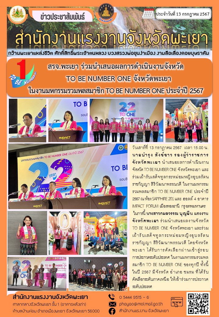 สรจ.พะเยา ร่วมนำเสนอผลการดำเนินงานจังหวัด TO BE NUMBER ONE จังหวัดพะเยา ในงานมหกรรมรวมพลสมาชิก TO BE NUMBER ONE ประจำปี 2567