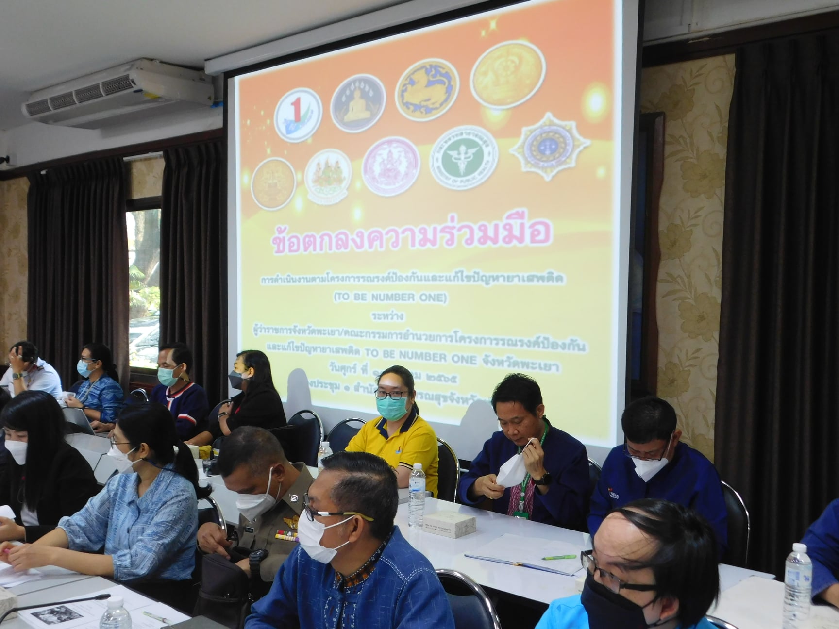 วันศุกร์ที่ 11 มีนาคม 2565 เวลา 10.00 น. นายศักดิ์ฤทธิ์ สลักคำ ผู้ว่าราชการจังหวัดพะเยา เป็นประธานการประชุมคณะกรรมการ/คณะทำงานโครงการรณรงค์ป้องกันและแก้ไข ปัญหายาเสพติด TO BE NUMBER ONE จังหวัดพะเยา และลงนามในบันทึกข้อตกลงความร่วมมือ (MOU) ระหว่างหน่วยงานที่เกี่ยวข้องเพื่อขับเคลื่อนการดำเนินงานโครงการ TO BE NUMBER ONE จังหวัดพะเยา โดยมีนายแพทย์สาธารณสุขจังหวัดพะเยา ปลัดจังหวัดพะเยา หัวหน้าส่วนราชการที่เกี่ยวข้องทุกภาคส่วนเข้าร่วมประชุม ในการนี้ นางสาวกมลวรรณ บุญยืน แรงงานจังหวัดพะเยา พร้อมด้วยนางสาวนันทวรรณ ณ ลำปาง นักวิชาการแรงงานชำนาญการ และนางสาววรางคณา ศรีสวัสดิ์ นักวิชาการแรงงานชำนาญการ เข้าร่วมประชุมและรายงานผลการดำเนินโครงการป้องกันและแก้ไขปัญหายาเสพติดในสถานประกอบการ (TO BE NUMBER ONE) ประจำปีงบประมาณ พ.ศ. 2565 ณ ห้องประชุม 1 สำนักงานสาธารณสุขจังหวัดพะเยา