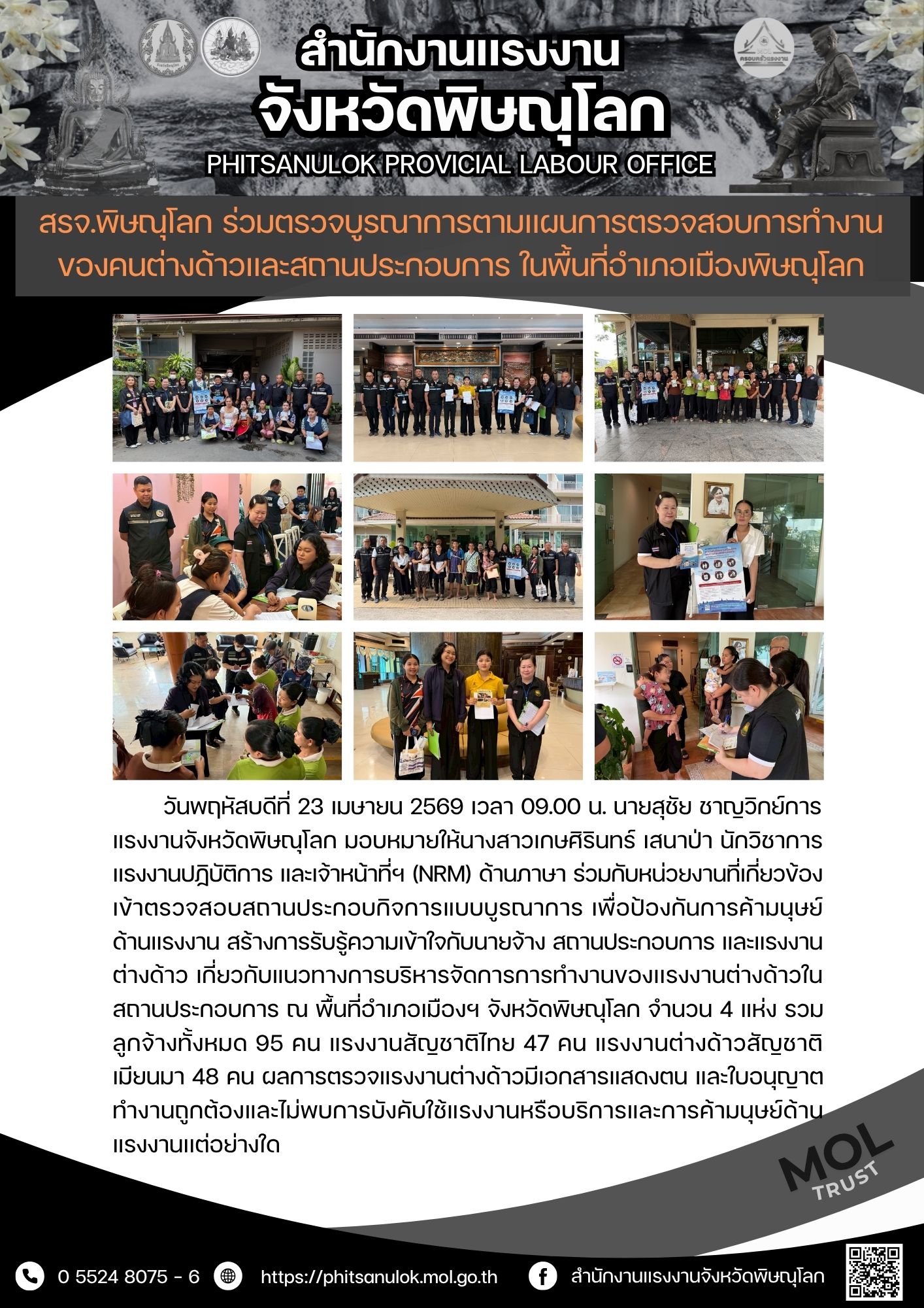 สรจ.พิษณุโลก ร่วมตรวจบูรณาการตามเเผนการตรวจสอบการทำงานของคนต่างด้าวเเละสถานประกอบการ ในพื้นที่อำเภอเมืองพิษณุโลก