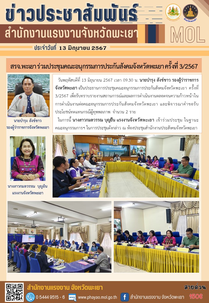 สรจ.พะเยา ร่วมประชุมคณะอนุกรรมการประกันสังคมจังหวัดพะเยา ครั้งที่ 3/2567