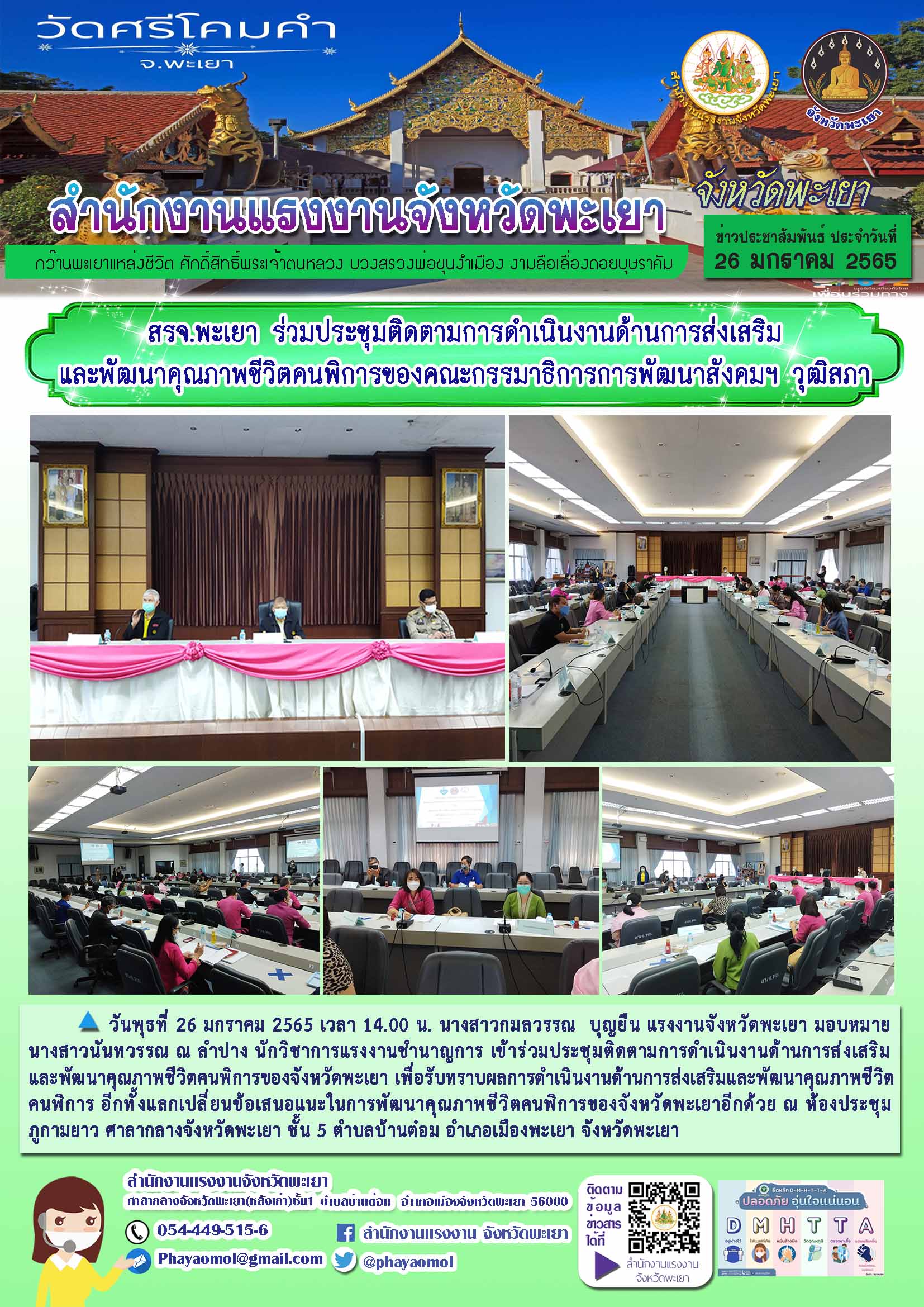 วันพุธที่ 26 มกราคม 2565 เวลา 14.00 น. นางสาวกมลวรรณ บุญยืน แรงงานจังหวัดพะเยา มอบหมายนางสาวนันทวรรณ ณ ลำปาง นักวิชาการแรงงานชำนาญการ เข้าร่วมประชุมติดตามการดำเนินงานด้านการส่งเสริมและพัฒนาคุณภาพชีวิตคนพิการของจังหวัดพะเยา เพื่อรับทราบผลการดำเนินงานด้านการส่งเสริมและพัฒนาคุณภาพชีวิตคนพิการ อีกทั้งแลกเปลี่ยนข้อเสนอแนะในการพัฒนาคุณภาพชีวิตคนพิการของจังหวัดพะเยาอีกด้วย ณ ห้องประชุมภูกามยาว ศาลากลางจังหวัดพะเยา ชั้น 5 ต.บ้านต๋อม อ.เมืองพะเยา จ.พะเยา