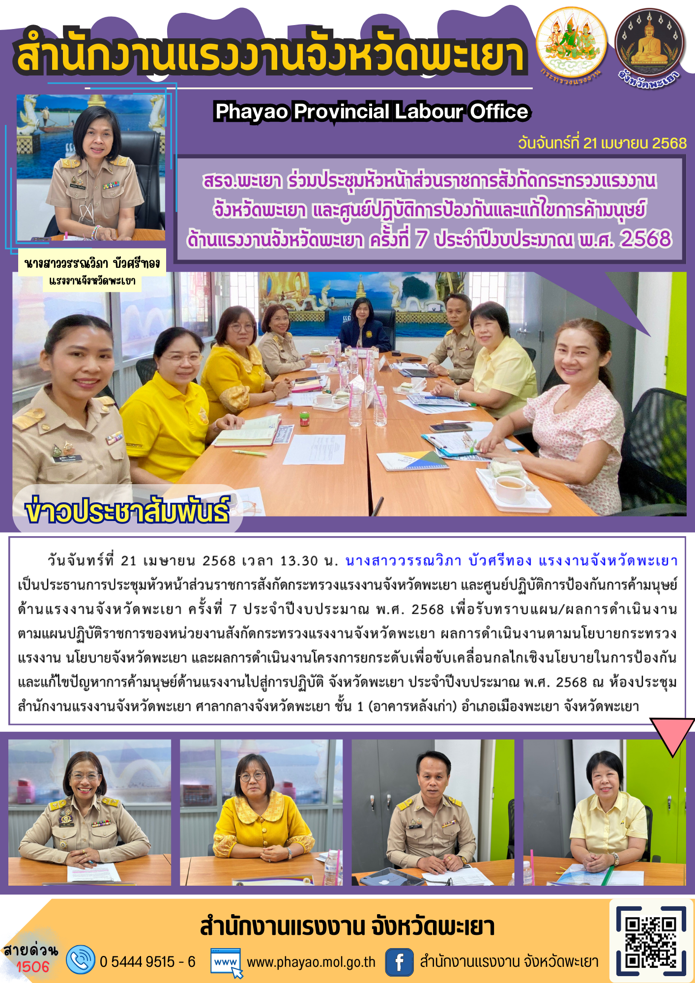 สรจ.พะเยา ร่วมประชุมหัวหน้าส่วนราชการสังกัดกระทรวงแรงงานจังหวัดพะเยา และศูนย์ปฏิบัติการป้องกันและแก้ไขการค้ามนุษย์ด้านแรงงานจังหวัดพะเยา ครั้งที่ 7 ประจำปีงบประมาณ พ.ศ. 2568