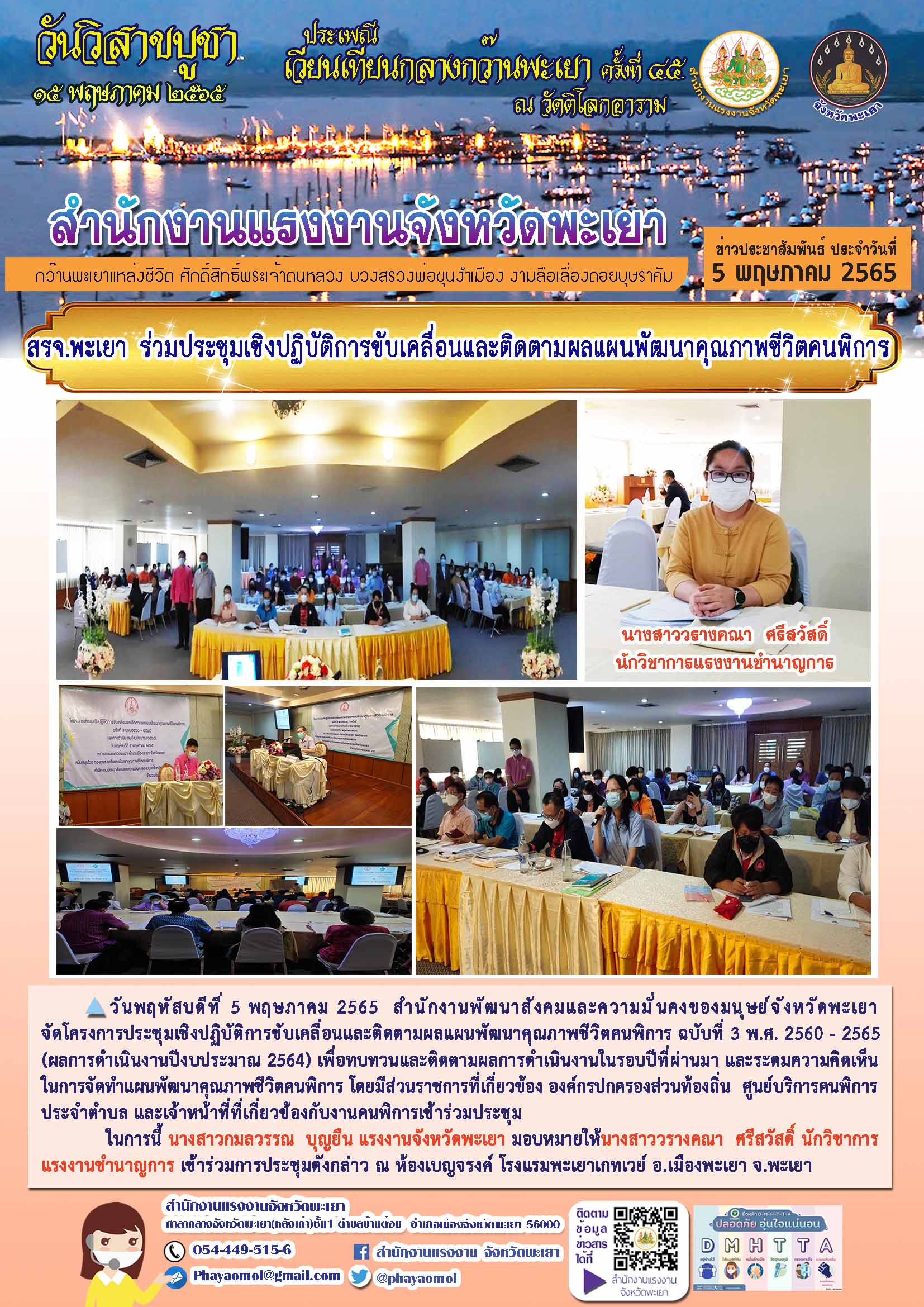 วันพฤหัสบดีที่ 5 พฤษภาคม 2565 เวลา 08.30 น. สำนักงานพัฒนาสังคมและความมั่นคงของมนุษย์จังหวัดพะเยา จัดโครงการประชุมเชิงปฏิบัติการขับเคลื่อนและติดตามผลแผนพัฒนาคุณภาพชีวิตคนพิการ ฉบับที่ 3 พ.ศ. 2560 – 2565 (ผลการดำเนินงานปีงบประมาณ 2564) เพื่อทบทวนและติดตามผลการดำเนินงานในรอบปีที่ผ่านมา และระดมความคิดเห็นในการจัดทำแผนพัฒนาคุณภาพชีวิตคนพิการ โดยมีส่วนราชการที่เกี่ยวข้อง องค์กรปกครองส่วนท้องถิ่น ศูนย์บริการคนพิการประจำตำบล และเจ้าหน้าที่ที่เกี่ยวข้องกับงานคนพิการเข้าร่วมประชุม ในการนี้ นางสาวกมลวรรณ บุญยืน แรงงานจังหวัดพะเยา มอบหมายให้นางสาววรางคณา ศรีสวัสดิ์ นักวิชาการแรงงานชำนาญการ เข้าร่วมการประชุมดังกล่าว ณ ห้องเบญจรงค์ โรงแรมพะเยาเกทเวย์ อ.เมืองพะเยา จ.พะเยา