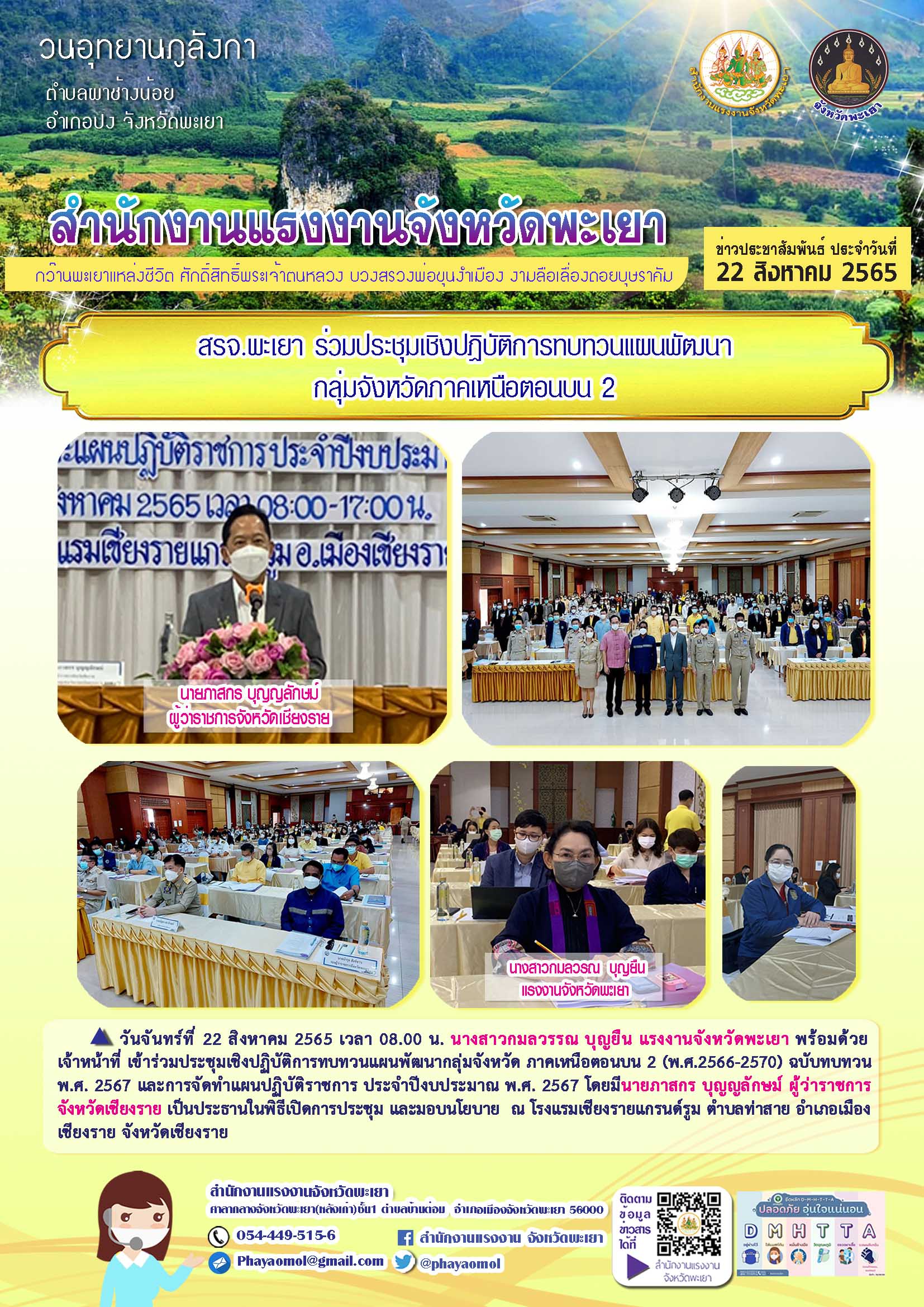 “สรจ.พะเยา ร่วมประชุมเชิงปฏิบัติการทบทวนแผนพัฒนากลุ่มจังหวัดภาคเหนือตอนบน 2” วันจันทร์ที่ 22 สิงหาคม 2565 เวลา 09.00 น. นางสาวกมลวรรณ บุญยืน แรงงานจังหวัดพะเยา พร้อมด้วยเจ้าหน้าที่