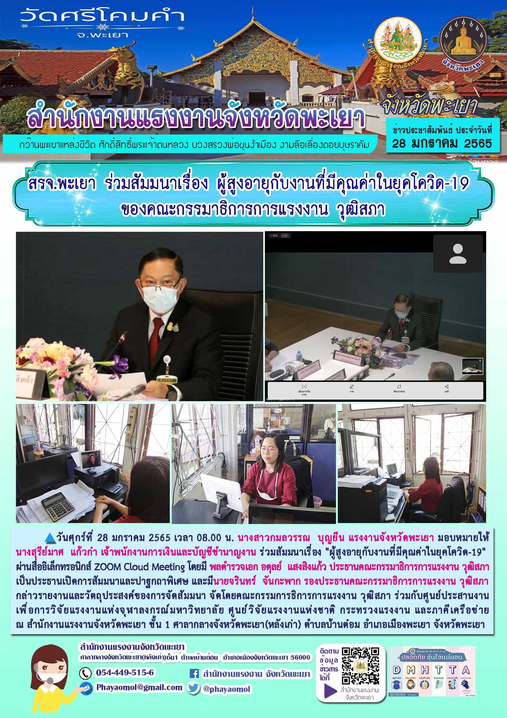 วันศุกร์ที่ 28 มกราคม 2565 เวลา 08.00 น. นางสาวกมลวรรณ บุญยืน แรงงานจังหวัดพะเยา มอบหมายให้นางสุรีย์มาศ แก้วก๋า เจ้าพนักงานการเงินและบัญชีชำนาญงาน ร่วมสัมมนาเรื่อง “ผู้สูงอายุกับงานที่มีคุณค่าในยุคโควิด-19” ผ่านสื่ออิเล็กทรอนิกส์ ZOOM Cloud Meeting โดยมี พลตำรวจเอก อดุลย์ แสงสิงแก้ว ประธานคณะกรรมาธิการการแรงงาน วุฒิสภา เป็นประธานเปิดการสัมมนาและปาฐกถาพิเศษ และมีนายจรินทร์ จันกะพาก รองประธานคณะกรรมาธิการการแรงงาน วุฒิสภา กล่าวรายงานและวัตถุประสงค์ของการจัดสัมมนาจัดโดยคณะกรรมการธิการการแรงงานวุฒิสภาร่วมกับศูนย์ประสานงานเพื่อการวิจัยแรงงานแห่งจุฬาลงกรณ์มหาวิทยาลัย ศูนย์วิจัยแรงงานแห่งชาติ กระทรวงแรงงาน และภาคีเครือข่าย ณ สำนักงานแรงงานจังหวัดพะเยา