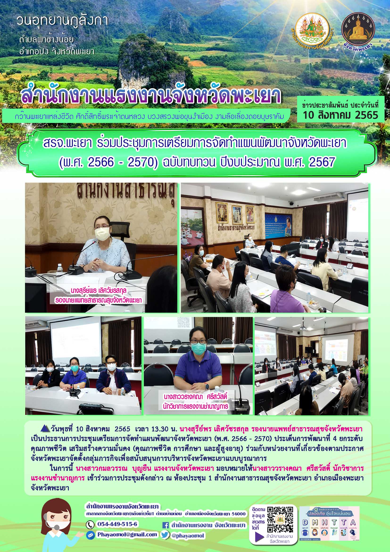 วันพุธที่ 10 สิงหาคม 2565 เวลา 13.30 น. นางสุรีย์พร เลิศวัชรสกุล รองนายแพทย์สาธารณสุขจังหวัดพะเยา เป็นประธานการประชุมเตรียมการจัดทำแผนพัฒนาจังหวัดพะเยา (พ.ศ. 2566 - 2570) ประเด็นการพัฒนาที่ 4 ยกระดับคุณภาพชีวิต เสริมสร้างความมั่นคง (คุณภาพชีวิต การศึกษา และผู้สูงอายุ) ร่วมกับหน่วยงานที่เกี่ยวข้องตามประกาศจังหวัดพะเยาจัดตั้งกลุ่มภารกิจเพื่อสนับสนุนการบริหารจังหวัดพะเยาแบบบูรณาการ ในการนี้ นางสาวกมลวรรณ บุญยืน แรงงานจังหวัดพะเยา มอบหมายให้นางสาววรางคณา ศรีสวัสดิ์ นักวิชาการแรงงานชำนาญการ เข้าร่วมการประชุมดังกล่าว ณ ห้องประชุม 1 สำนักงานสาธารณสุขจังหวัดพะเยา อำเภอเมืองพะเยา จังหวัดพะเยา