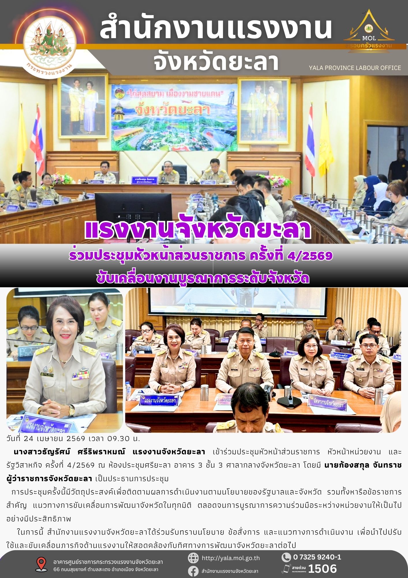 วันศุกร์ที่ 18 มีนาคม 2565 เวลา 09.00 น. นายบำรุง สังข์ขาว รองผู้ว่าราชการจังหวัดพะเยา เป็นประธานการประชุมคณะกรรมการขับเคลื่อนและติดตามการประเมินผลการปฏิบัติราชการของจังหวัดพะเยา ประจำปีงบประมาณ พ.ศ. 2565 ครั้งที่ 1/2565 เพื่อรับทราบความก้าวหน้าการดำเนินงานตามตัวชี้วัดการประเมินส่วนราชการตามาตรการปรับปรุงประสิทธิภาพในการปฏิบัติราชการของจังหวัด ประจำปีงบประมาณ พ.ศ. 2565 และพิจารณาคัดเลือกตัวชี้วัดการปฏิบัติราชการของรองผู้ว่าราชการจังหวัดพะเยา รอบการประเมินครั้งที่ 1/2565 และพิจารณากำหนดตัวชี้วัดร่วม (Joint KPIs) ในการขับเคลื่อนและติดตามประเมินผลการปฏิบัติราชการของจังหสัดพะเยา ในการนี้ นางสาวกมลวรรณ บุญยืน แรงงานจังหวัดพะเยา มอบหมายให้นางสาววรางคณา ศรีสวัสดิ์ นักวิชาการแรงงานชำนาญการ เข้าร่วมการประชุมดังกล่าว ณ ห้องประชุมจอมทอง ศาลากลางจังหวัดพะเยา ชั้น 4 ต.บ้านต๋อม อ.เมืองพะเยา จ.พะเยา