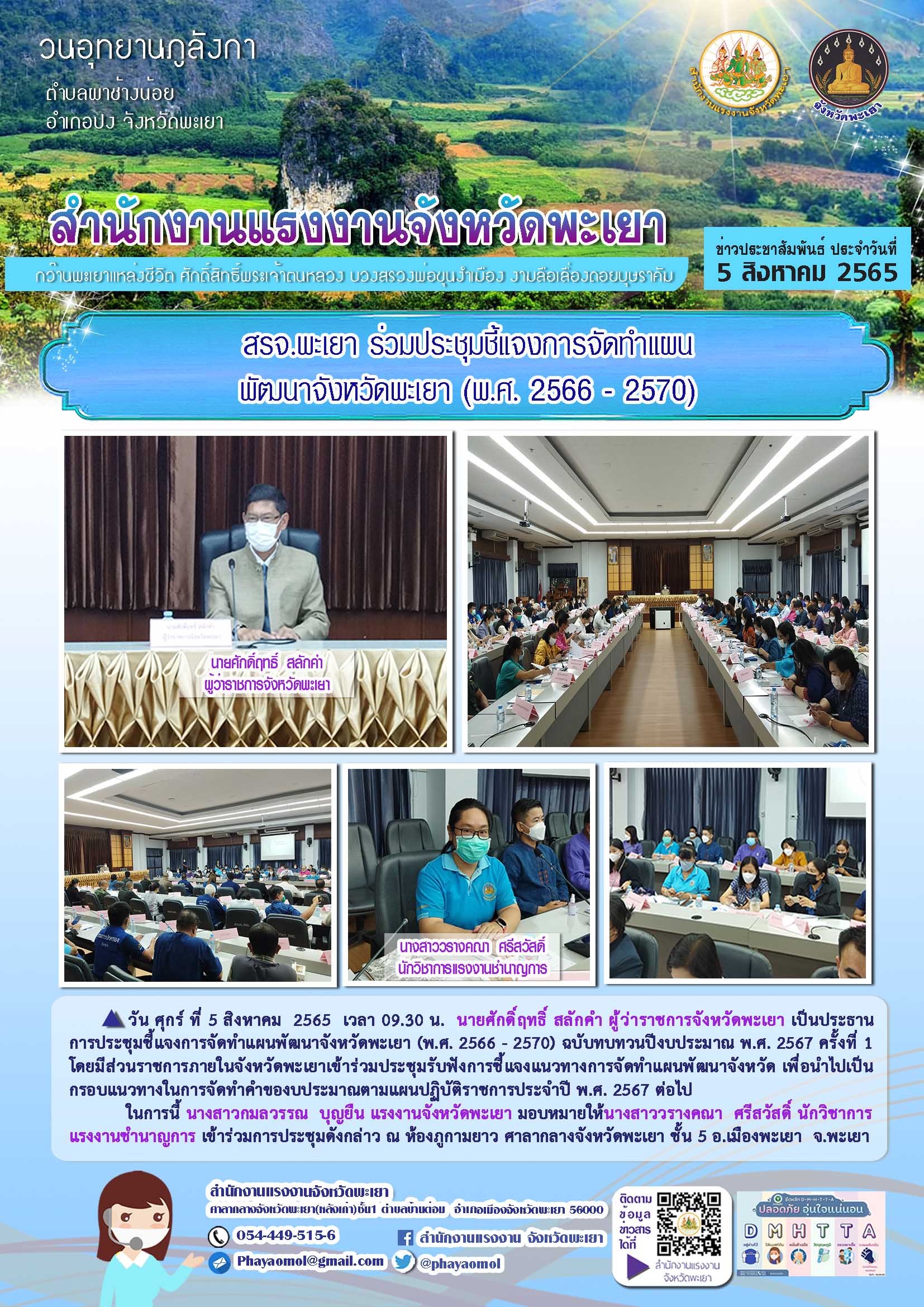 วันศุกร์ที่ 5 สิงหาคม 2565 เวลา 09.30 น. นายศักดิ์ฤทธิ์ สลักคำ ผู้ว่าราชการจังหวัดพะเยา เป็นประธานการประชุมชี้แจงการจัดทำแผนพัฒนาจังหวัดพะเยา (พ.ศ. 2566 - 2570) ฉบับทบทวนปีงบประมาณ พ.ศ. 2567 ครั้งที่ 1 โดยมีส่วนราชการภายในจังหวัดพะเยาเข้าร่วมประชุมรับฟังการชี้แจงแนวทางการจัดทำแผนพัฒนาจังหวัด เพื่อนำไปเป็นกรอบแนวทางในการจัดทำคำของบประมาณตามแผนปฏิบัติราชการประจำปี พ.ศ. 2567 ต่อไป ในการนี้ นางสาวกมลวรรณ บุญยืน แรงงานจังหวัดพะเยา มอบหมายให้นางสาววรางคณา ศรีสวัสดิ์ นักวิชาการแรงงานชำนาญการ เข้าร่วมการประชุมดังกล่าว ณ ห้องภูกามยาว ศาลากลางจังหวัดพะเยา ชั้น 5 อ.เมืองพะเยา จ.พะเยา