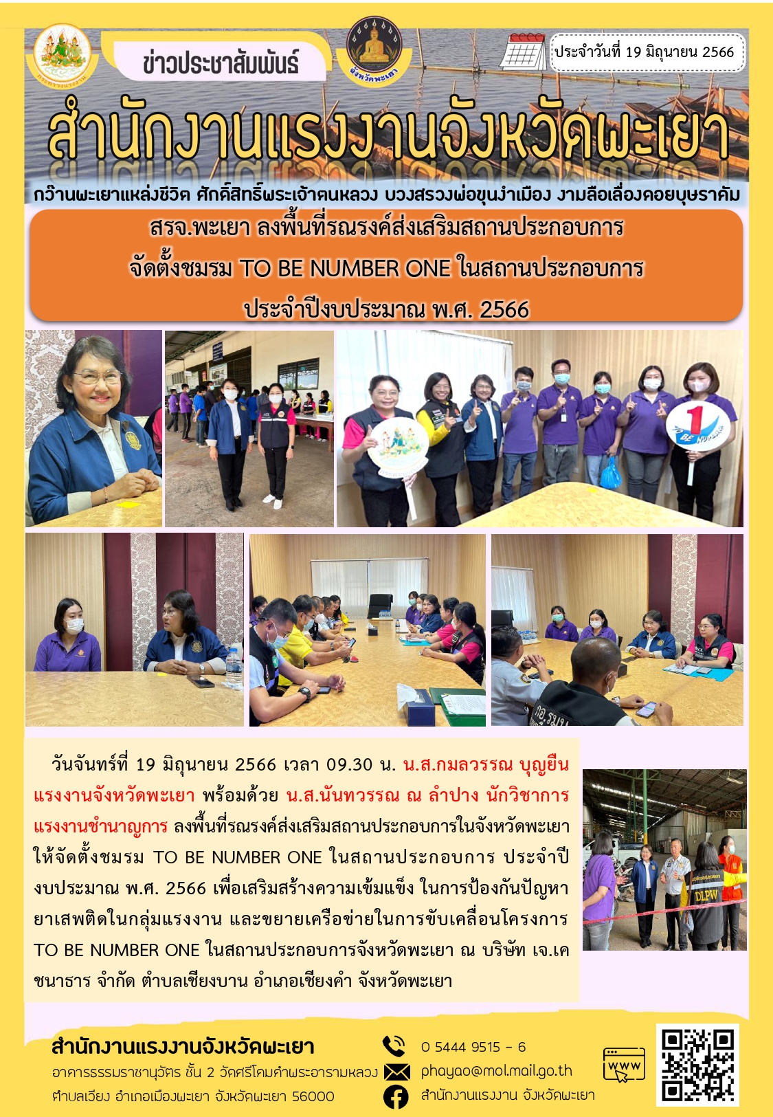 สรจ.พะเยา ลงพื้นที่รณรงค์ส่งเสริมสถานประกอบการ จัดตั้งชมรม TO BE NUMBER ONE ในสถานประกอบการ ประจำปีงบประมาณ พ.ศ. 2566