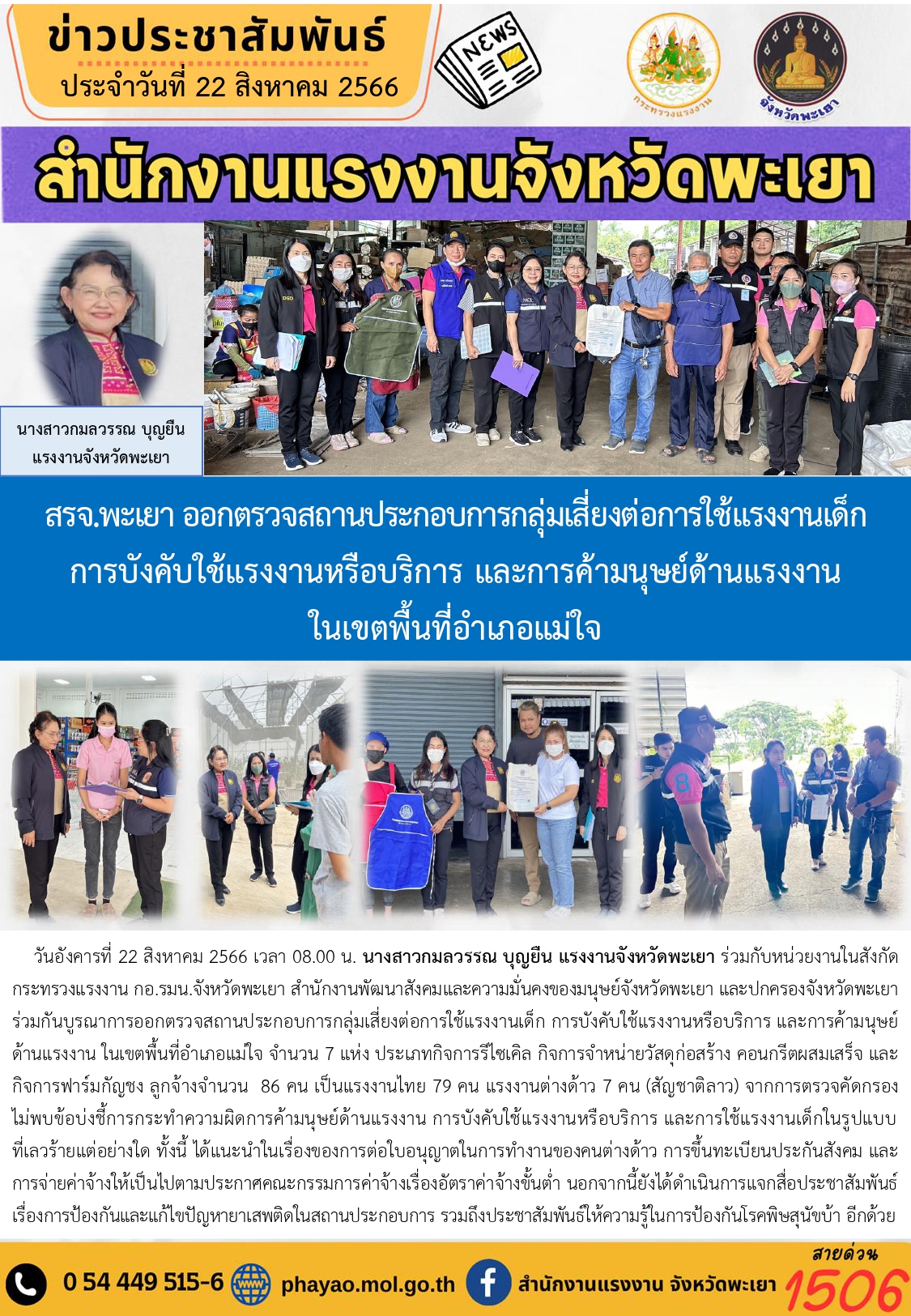 สรจ.พะเยา ออกตรวจสถานประกอบการกลุ่มเสี่ยงต่อการใช้แรงงานเด็ก การบังคับใช้แรงงานหรือบริการ และการค้ามนุษย์ด้านแรงงาน ในเขตพื้นที่อำเภอแม่ใจ