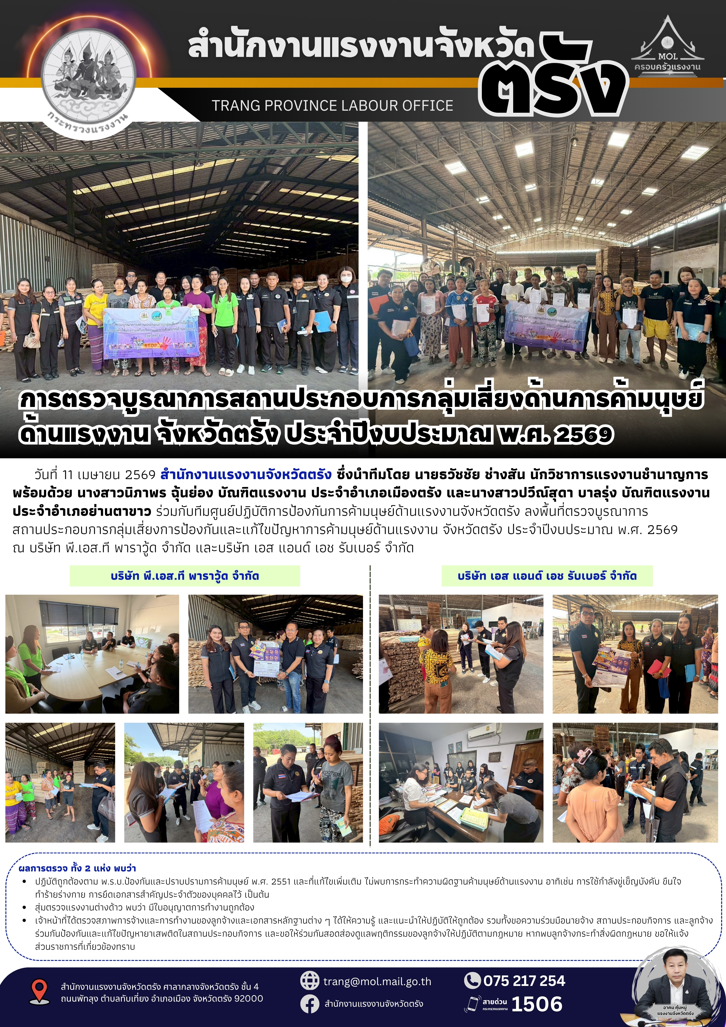 สรจ.ตรัง ลงพื้นที่ตรวจบูรณาการสถานประกอบการกลุ่มเสี่ยงการป้องกันและแก้ไขปัญหาการค้ามนุษย์ด้านแรงงานจังหวัดตรัง ประจำปีงบประมาณ พ.ศ. 2569 ณ บริษัท พี.เอส.ที พาราวู้ด จำกัด และบริษัท เอส แอนด์ เอช รับเบอร์ จำกัด