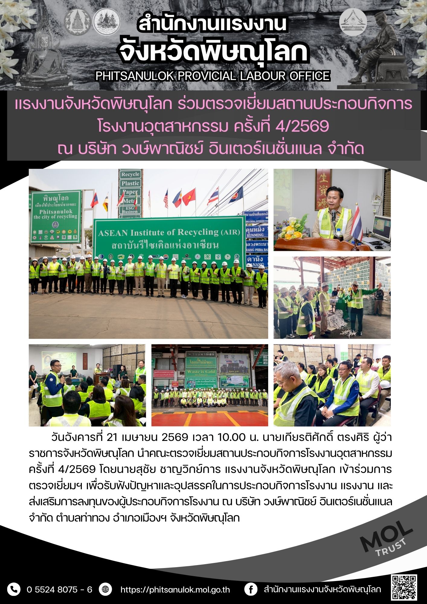 แรงงานจังหวัดพิษณุโลก ร่วมตรวจเยี่ยมสถานประกอบกิจการ โรงงานอุตสาหกรรม ครั้งที่ 4/2569 ณ บริษัท วงษ์พาณิชย์ อินเตอร์เนชั่นแนล จำกัด