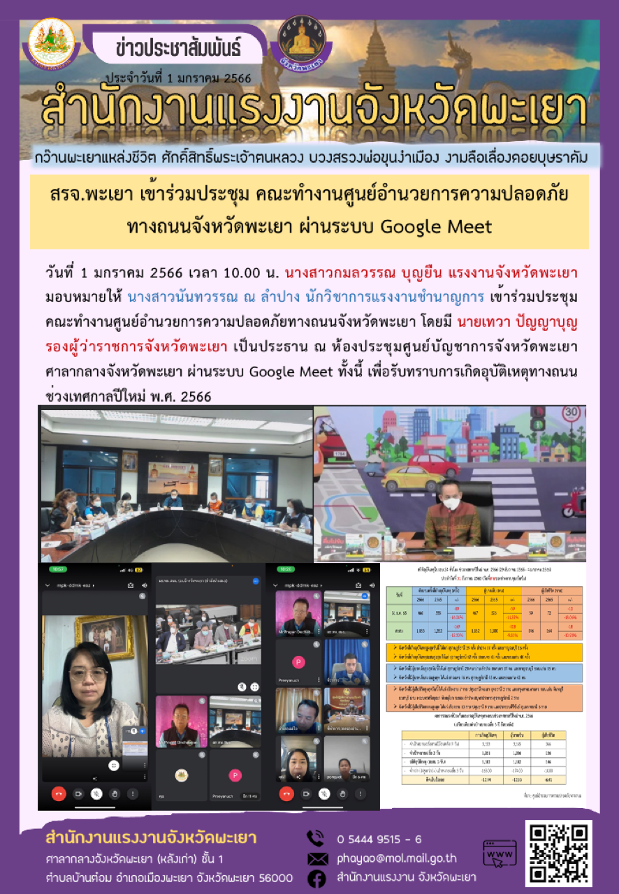 สรจ.พะเยา เข้าร่วมประชุม คณะทำงานศูนย์อำนวยการความปลอดภัยทางถนนจังหวัดพะเยา ผ่านระบบ Google Meet