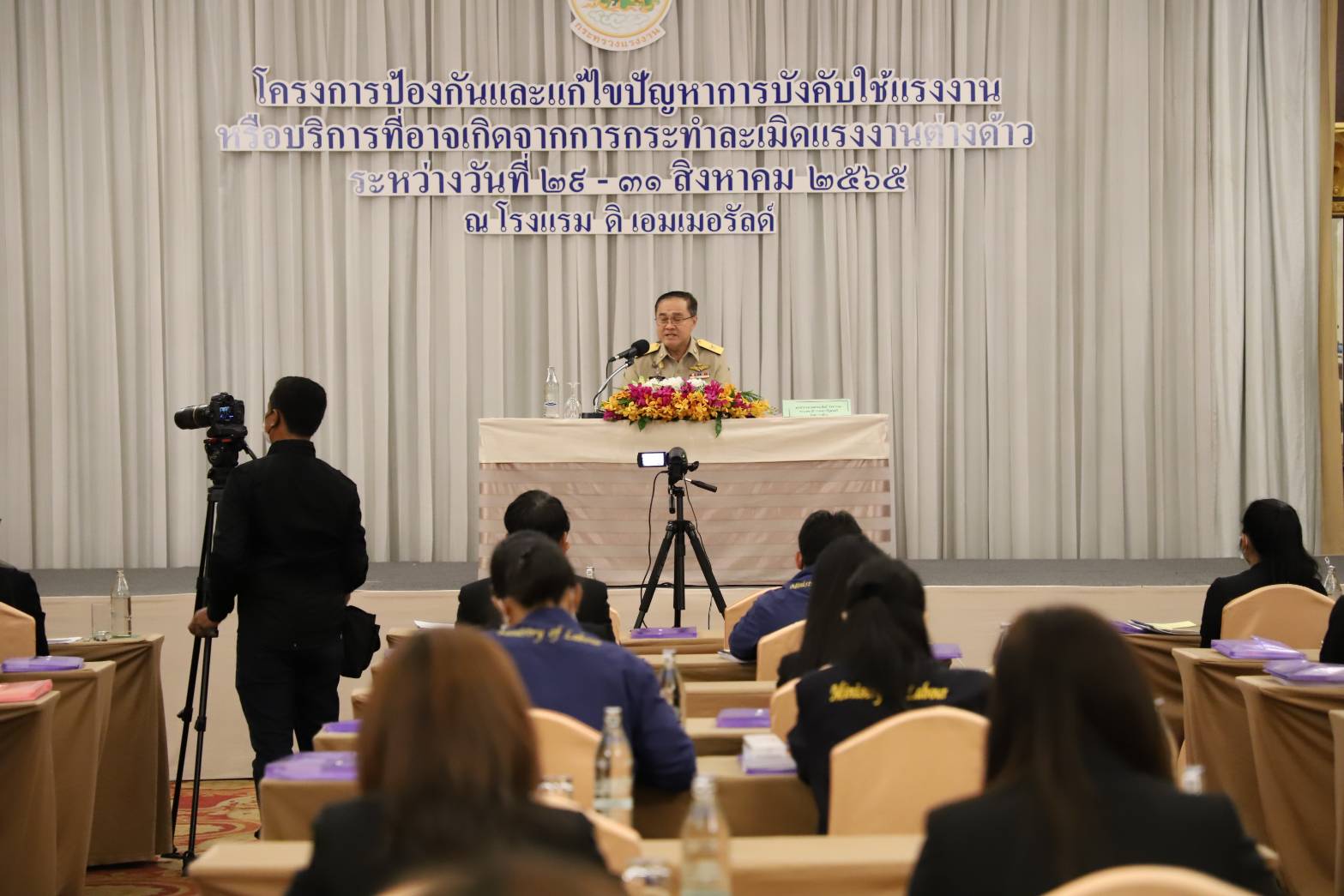 วันที่ 29 สิงหาคม 2565 นางสาวกมลวรรณ บุญยืน แรงงานจังหวัดพะเยา มอบหมายให้นางสาวนันทวรรณ ณ ลำปาง นักวิชาการแรงงานชำนาญการเข้าร่วมฝึกอบรมหลักสูตรการป้องกันและแก้ไขการบังคับใช้แรงงานหรือบริการที่อาจเกิดจากการกระทำละเมิดแรงงานต่างด้าว ตามโครงการการป้องกันและแก้ไขการบังคับใช้แรงงานหรือการบริการที่อาจเกิดจากการกระทำละเมิดแรงงานต่างด้าว ระหว่างวันที่ 29-31 สิงหาคม 2565 ณ โรงแรมดิเอมเมอรัลด์ กรุงเทพมหานคร โดยมี พลตำรวจเอก ดร.ธรรมศักดิ์ วิชชารยะ รองเลขาธิการนายกรัฐมนตรี เป็นประธานในพิธีเปิดการอบรมในครั้งนี้มีวัตถุประสงค์เพื่อให้ผู้เข้ารับการอบรมมีความรู้ความเข้าใจเกี่ยวกับนโยบาย กฎหมาย ระเบียบแนวปฏิบัติที่เกี่ยวข้องกับการบังคับใช้แรงงานหรือบริการ มาตรฐานการปฏิบัติงาน (Standard Operating Procedure : SOP) แผนปฏิบัติการว่าด้วยกลไกการส่งต่อระดับชาติ และสามารถนำความรู้ที่ได้รับไปขับเคลื่อนการดำเนินงานในพื้นที่ได้อย่างมีประสิทธิภาพ