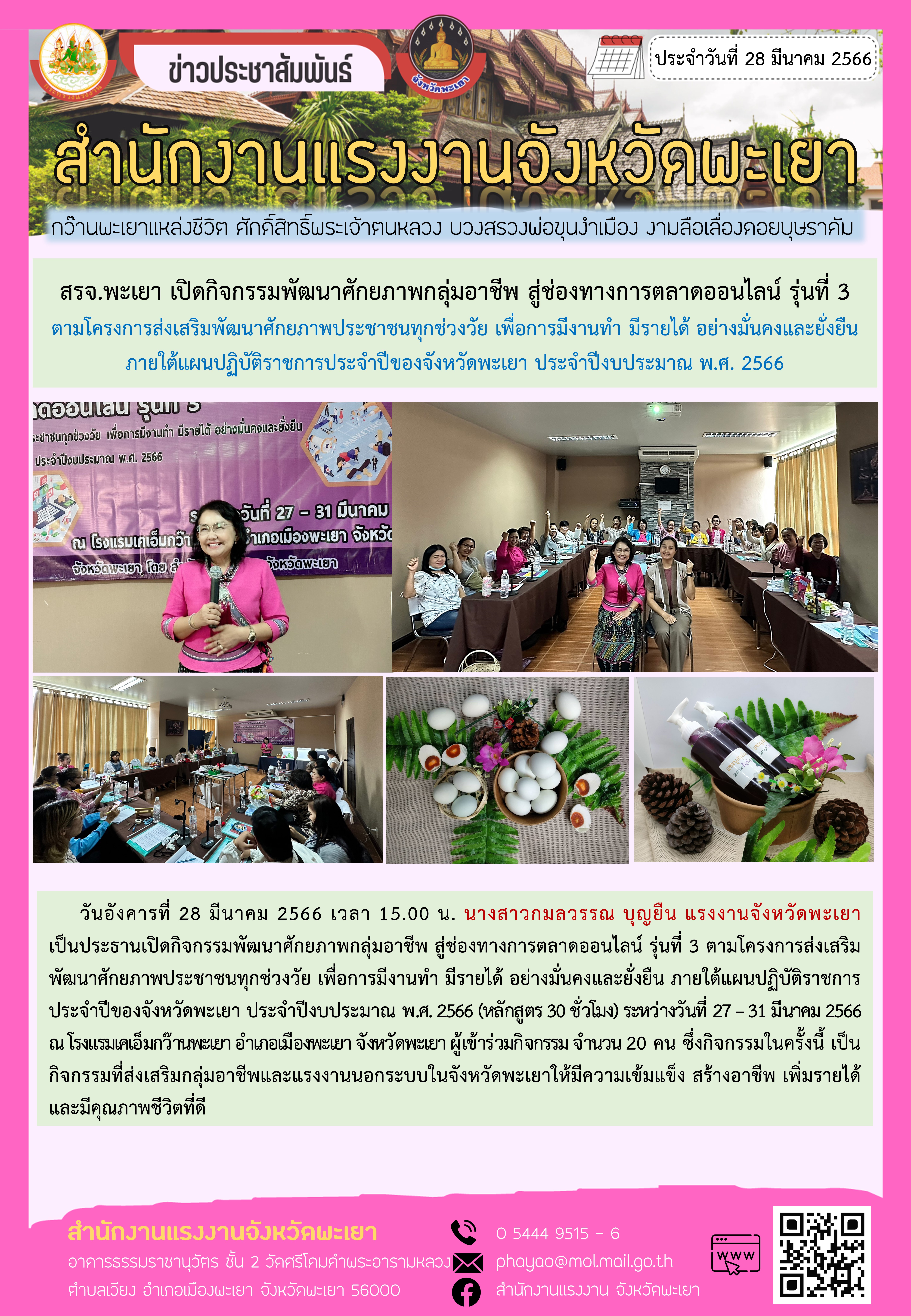 สรจ.พะเยา เปิดกิจกรรมพัฒนาศักยภาพกลุ่มอาชีพ สู่ช่องทางการตลาดออนไลน์ รุ่นที่ 3 ตามโครงการส่งเสริมพัฒนาศักยภาพประชาชนทุกช่วงวัย เพื่อการมีงานทำ มีรายได้ อย่างมั่นคงและยั่งยืน ภายใต้แผนปฏิบัติราชการประจำปีของจังหวัดพะเยา ประจำปีงบประมาณ พ.ศ. 2566