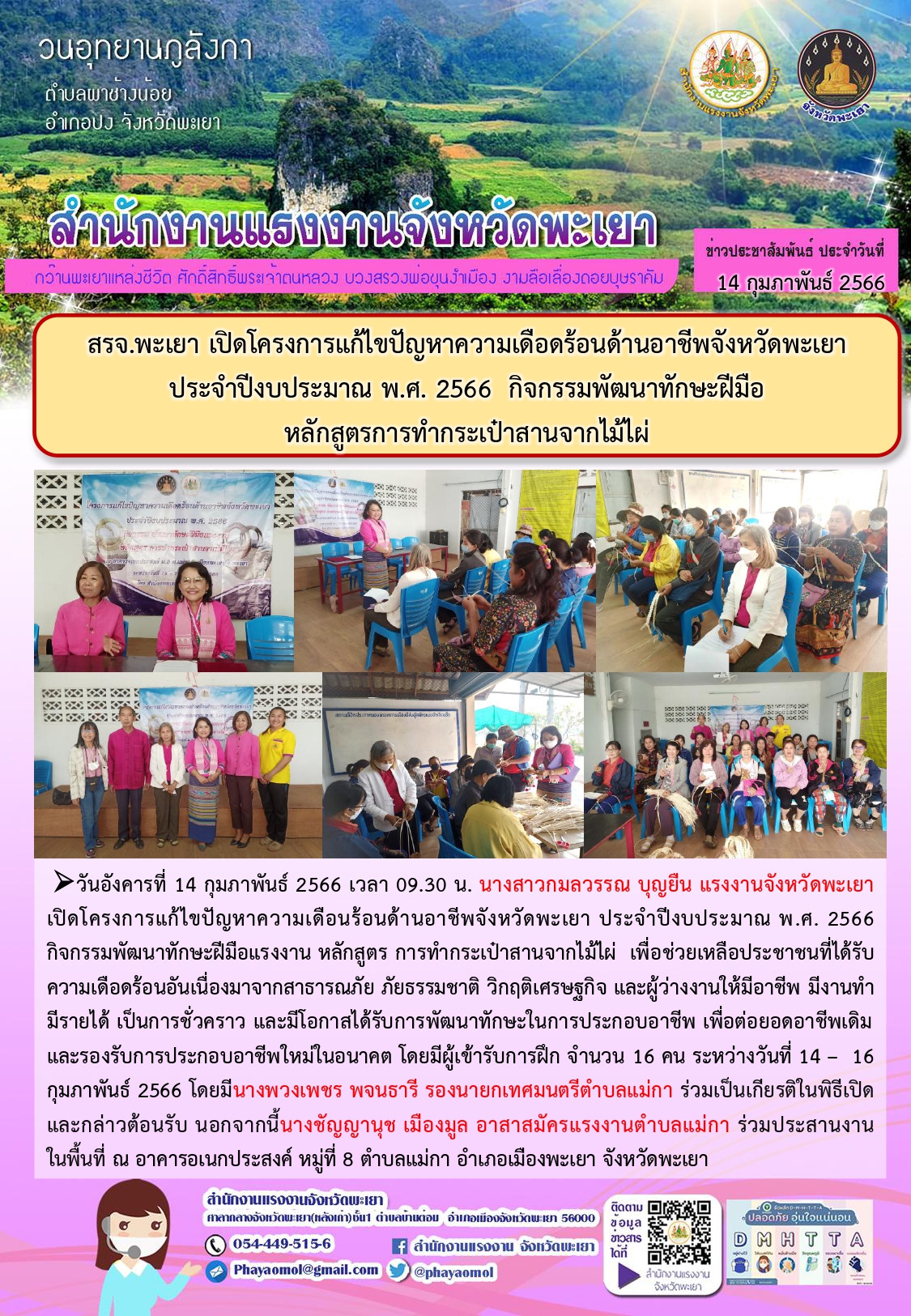 สรจ.พะเยา เปิดโครงการแก้ไขปัญหาความเดือดร้อนด้านอาชีพจังหวัดพะเยา ประจำปีงบประมาณ พ.ศ. 2566 กิจกรรมพัฒนาทักษะฝีมือ หลักสูตร การทำกระเป๋าสานจากไม้ไผ่