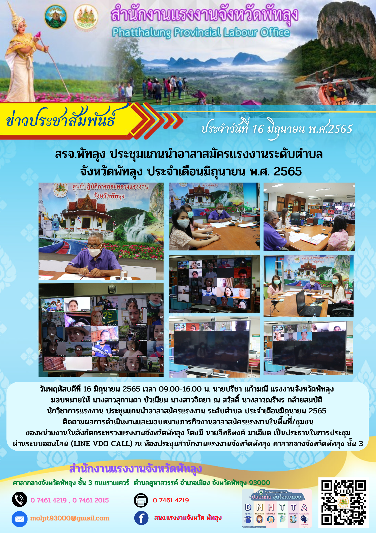 วันพฤหัสบดีที่ 16 มิถุนายน 2565 เวลา 09.00-16.00 น. นายปรีชา แก้วมณี แรงงานจังหวัดพัทลุงมอบหมายให้ นางสาวสุกานดา บัวเนียม นางสาวจิตยา ณ สวัสดิ์ นางสาวณรีพร คล้ายสมบัตินักวิชาการแรงงาน ประชุมแกนนำอาสาสมัครแรงงาน ระดับตำบล ประจำเดือนมิถุนายน 2565ติดตามผลการดำเนินงานและมอบหมายภารกิจงานอาสาสมัครแรงงานในพื้นที่/ชุมชนของหน่วยงานในสังกัดกระทรวงแรงงานจังหวัดพัทลุง โดยมี นายสิทธิพงศ์ มาเอียด เป็นประธานในการประชุม ผ่านระบบออนไลน์ (LINE VDO CALL) ณ ห้องประชุมสำนักงานแรงงานจังหวัดพัทลุง ศาลากลางจังหวัดพัทลุง ชั้น 3