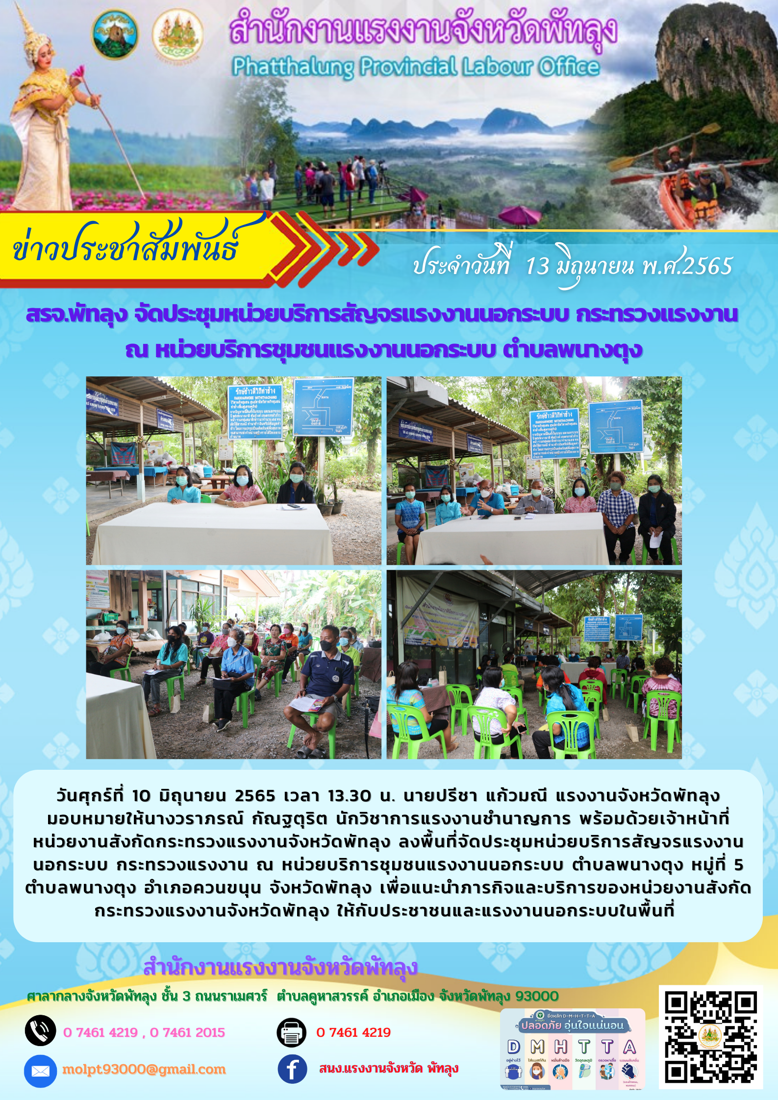วันศุกร์ที่ 10 มิถุนายน 2565 เวลา 13.30 น. นายปรีชา แก้วมณี แรงงานจังหวัดพัทลุง มอบหมายให้นางวราภรณ์ กัณฐตุริต นักวิชาการแรงงานชำนาญการ พร้อมด้วยเจ้าหน้าที่หน่วยงานสังกัดกระทรวงแรงงานจังหวัดพัทลุง ลงพื้นที่จัดประชุมหน่วยบริการสัญจรแรงงานนอกระบบ กระทรวงแรงงาน ณ หน่วยบริการชุมชนแรงงานนอกระบบ ตำบลพนางตุง หมู่ที่ 5 ตำบลพนางตุง อำเภอควนขนุน จังหวัดพัทลุง เพื่อแนะนำภารกิจและบริการของหน่วยงานสังกัดกระทรวงแรงงานจังหวัดพัทลุง ให้กับประชาชนและแรงงานนอกระบบในพื้นที่