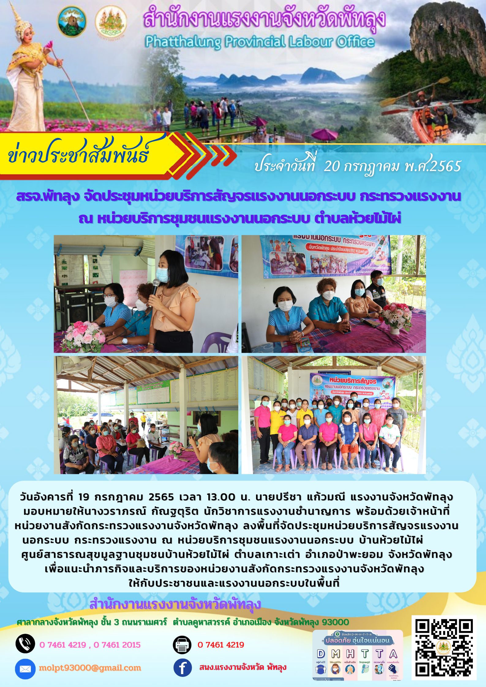 วันอังคารที่ 19 กรกฎาคม 2565 เวลา 13.00 น. นายปรีชา แก้วมณี แรงงานจังหวัดพัทลุง มอบหมายให้นางวราภรณ์ กัณฐตุริต นักวิชาการแรงงานชำนาญการ พร้อมด้วยเจ้าหน้าที่หน่วยงานสังกัดกระทรวงแรงงานจังหวัดพัทลุง ลงพื้นที่จัดประชุมหน่วยบริการสัญจรแรงงานนอกระบบ กระทรวงแรงงาน ณ หน่วยบริการชุมชนแรงงานนอกระบบ บ้านห้วยไม้ไผ่ ศูนย์สาธารณสุขมูลฐานชุมชนบ้านห้วยไม้ไผ่ ตำบลเกาะเต่า อำเภอป่าพะยอม จังหวัดพัทลุง เพื่อแนะนำภารกิจและบริการของหน่วยงานสังกัดกระทรวงแรงงานจังหวัดพัทลุงให้กับประชาชนและแรงงานนอกระบบในพื้นที่