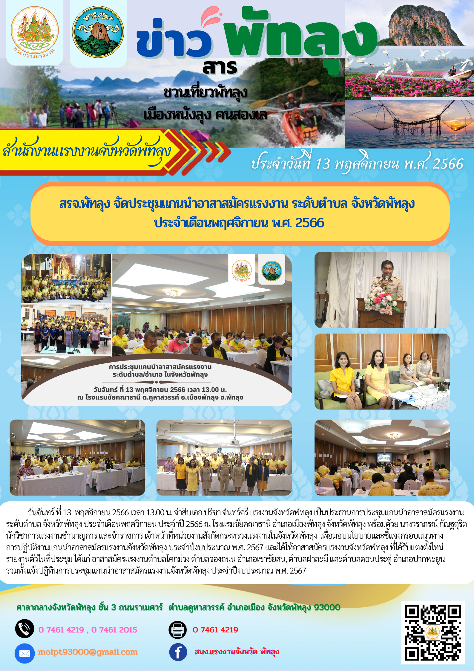 วันจันทร์ ที่ 13 พฤศจิกายน 2566 เวลา 13.00 น. จ่าสิบเอก ปรีชา จันทร์ศรี แรงงานจังหวัดพัทลุง เป็นประธานการประชุมแกนนำอาสาสมัครแรงงาน ระดับตำบล จังหวัดพัทลุง ประจำเดือนพฤศจิกายน ประจำปี 2566 ณ โรงแรมชัยคณาธานี อำเภอเมืองพัทลุง จังหวัดพัทลุง พร้อมด้วย นางวราภรณ์ กัณฐตุริต นักวิชาการแรงงานชำนาญการ และข้าราชการ เจ้าหน้าที่หน่วยงานสังกัดกระทรวงแรงงานในจังหวัดพัทลุง เพื่อมอบนโยบายและชี้แจงกรอบแนวทาง การปฏิบัติงานแกนนำอาสาสมัครแรงงานจังหวัดพัทลุง ประจำปีงบประมาณ พ.ศ. 2567 และได้ให้อาสาสมัครแรงงานจังหวัดพัทลุง ที่ได้รับแต่งตั้งใหม่ รายงานตัวในที่ประชุม ได้แก่ อาสาสมัครแรงงานตำบลโคกม่วง ตำบลจองถนน อำเภอเขาชัยสน, ตำบลฝาละมี และตำบลดอนประดู่ อำเภอปากพะยูน รวมทั้งแจ้งปฏิทินการประชุมแกนนำอาสาสมัครแรงงานจังหวัดพัทลุง ประจำปีงบประมาณ พ.ศ. 2567