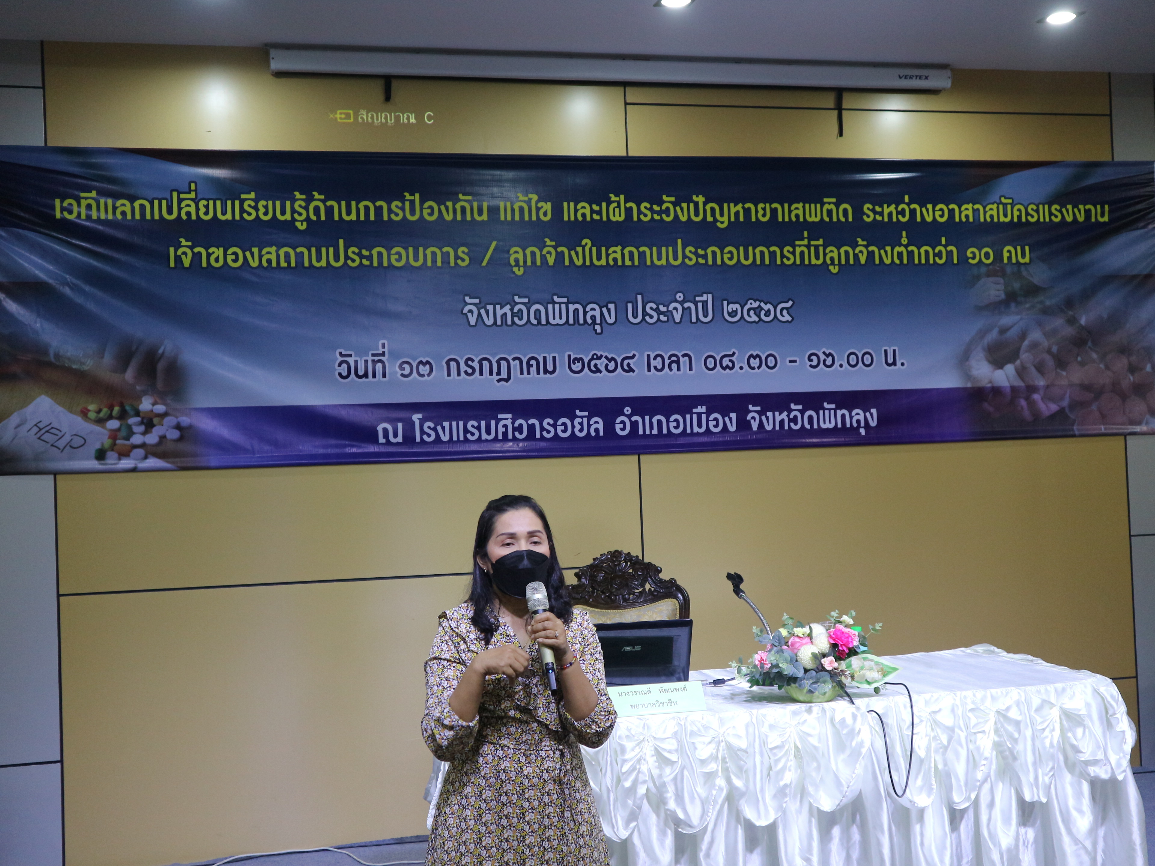 วันที่ 13 กรกฎาคม 2564 เวลา 09.00 น. นายปรีชา แก้วมณี แรงงานจังหวัดพัทลุง มอบหมายให้นางสาววรรณิษา แสงฉ่ำ นักวิชาการแรงงานชำนาญการ จัดเวทีแลกเปลี่ยนเรียนรู้การป้องกัน แก้ไข และเฝ้าระวังปัญหายาเสพติด ระหว่างอาสาสมัครแรงงาน เจ้าของสถานประกอบการ/ลูกจ้าง ในสถานประกอบการที่มีลูกจ้างต่ำกว่า 10 คนลงมา ประจำปี 2564 เพื่อแลกเปลี่ยนความคิดเห็น มุมมองในการดำเนินงานป้องกัน แก้ไข และเฝ้าระวังปัญหายาเสพติดในสถานประกอบการที่มีลูกจ้างต่ำกว่า 10 คน โดยมีอาสาสมัครแรงงาน เจ้าของสถานประกอบการ/ลูกจ้าง เข้าร่วม จำนวน 60 คน ณ โรงแรมศิวารอยัล ตำบลคูหาสวรรค์ อำเภอเมือง จังหวัดพัทลุง