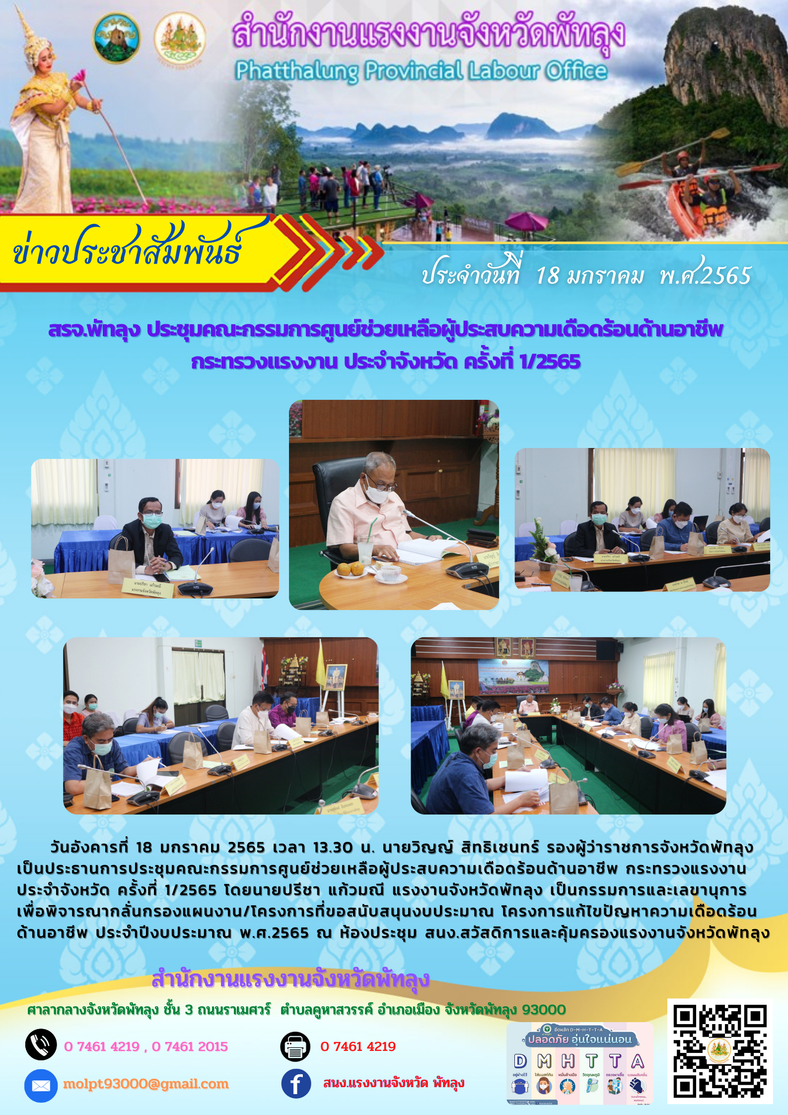 วันอังคารที่ 18 มกราคม 2565 เวลา 13.30 น. นายวิญญ์ สิทธิเชนทร์ รองผู้ว่าราชการจังหวัดพัทลุงเป็นประธานการประชุมคณะกรรมการศูนย์ช่วยเหลือผู้ประสบความเดือดร้อนด้านอาชีพ กระทรวงแรงงาน ประจำจังหวัด ครั้งที่ 1/2565 โดยนายปรีชา แก้วมณี แรงงานจังหวัดพัทลุง เป็นกรรมการและเลขานุการเพื่อพิจารณากลั่นกรองแผนงาน/โครงการที่ขอสนับสนุนงบประมาณ โครงการแก้ไขปัญหาความเดือดร้อนด้านอาชีพ ประจำปีงบประมาณ พ.ศ.2565 ณ ห้องประชุม สนง.สวัสดิการและคุ้มครองแรงงานจังหวัดพัทลุง