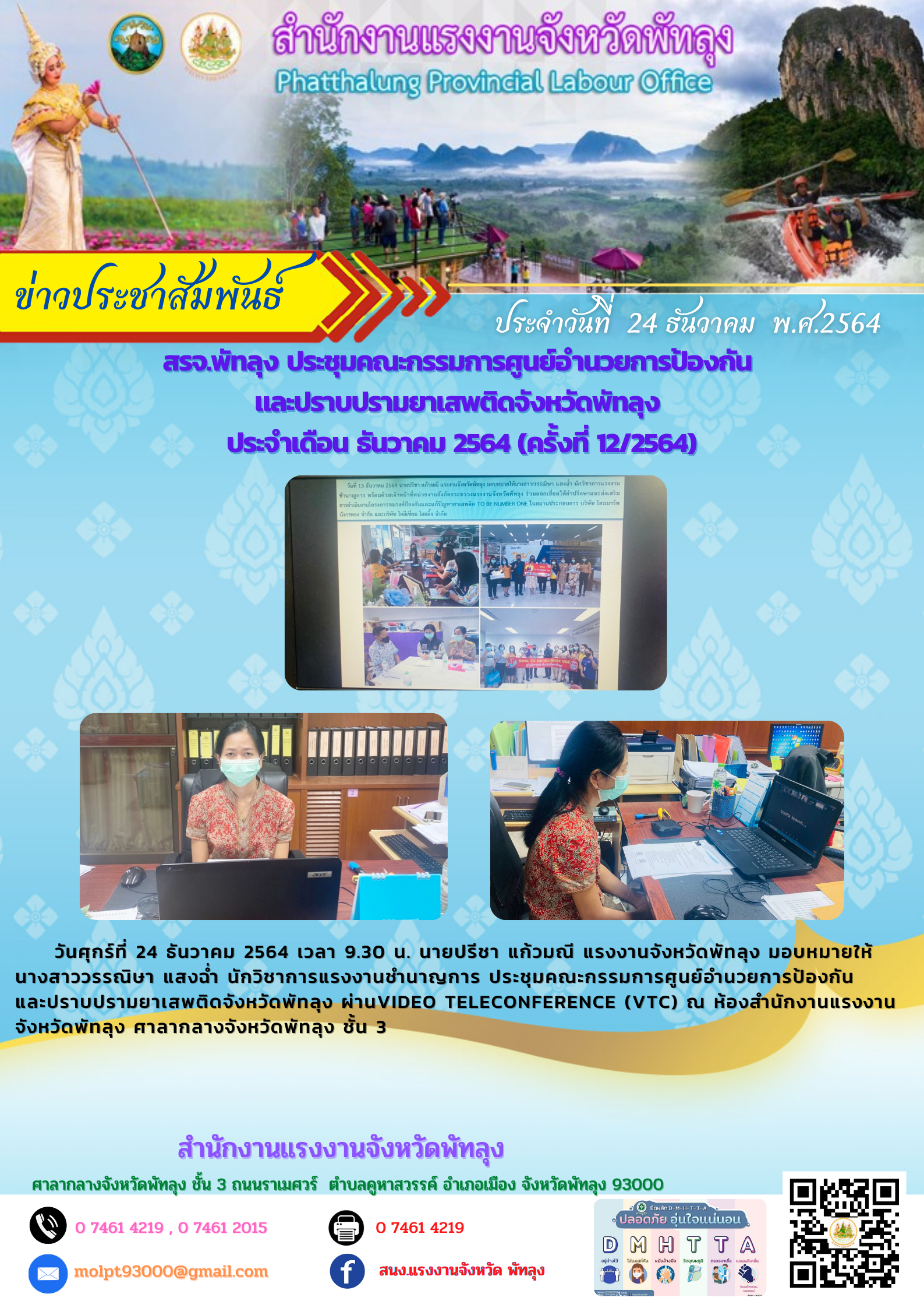 วันศุกร์ที่ 24 ธันวาคม 2564 เวลา 9.30 น. นายปรีชา แก้วมณี แรงงานจังหวัดพัทลุง มอบหมายให้ นางสาววรรณิษา แสงฉ่ำ นักวิชาการแรงงานชำนาญการ ประชุมคณะกรรมการศูนย์อำนวยการป้องกันและปราบปรามยาเสพติดจังหวัดพัทลุง ผ่านVideo Teleconference (vtc) ณ ห้องสำนักงานแรงงานจังหวัดพัทลุง ศาลากลางจังหวัดพัทลุง ชั้น 3