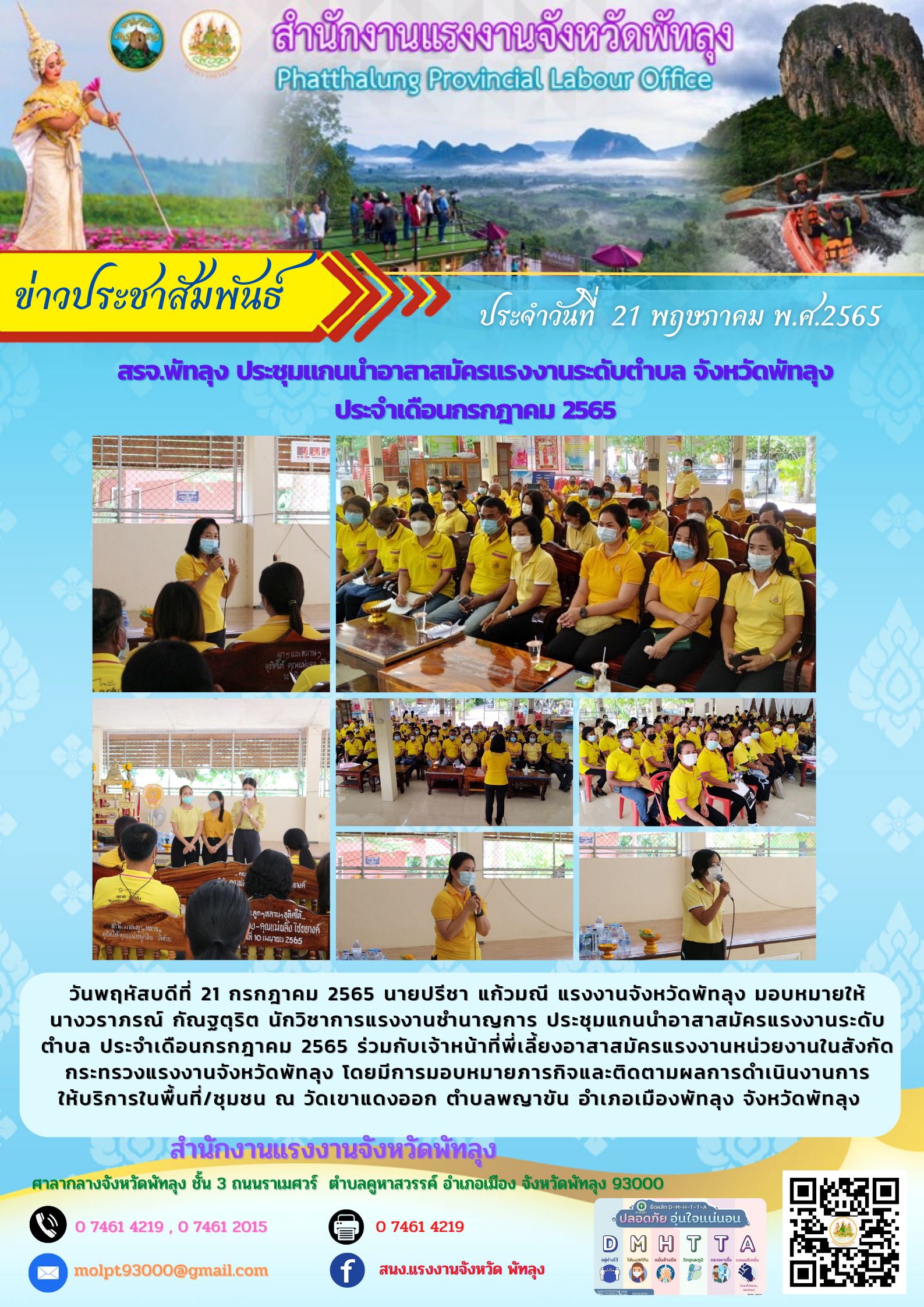 วันพฤหัสบดีที่ 21 กรกฎาคม 2565 นายปรีชา แก้วมณี แรงงานจังหวัดพัทลุง มอบหมายให้นางวราภรณ์ กัณฐตุริต นักวิชาการแรงงานชำนาญการ ประชุมแกนนำอาสาสมัครแรงงานระดับตำบล ประจำเดือนกรกฎาคม 2565 ร่วมกับเจ้าหน้าที่พี่เลี้ยงอาสาสมัครแรงงานหน่วยงานในสังกัดกระทรวงแรงงานจังหวัดพัทลุง โดยมีการมอบหมายภารกิจและติดตามผลการดำเนินงานการให้บริการในพื้นที่/ชุมชน ณ วัดเขาแดงออก ตำบลพญาขัน อำเภอเมืองพัทลุง จังหวัดพัทลุง