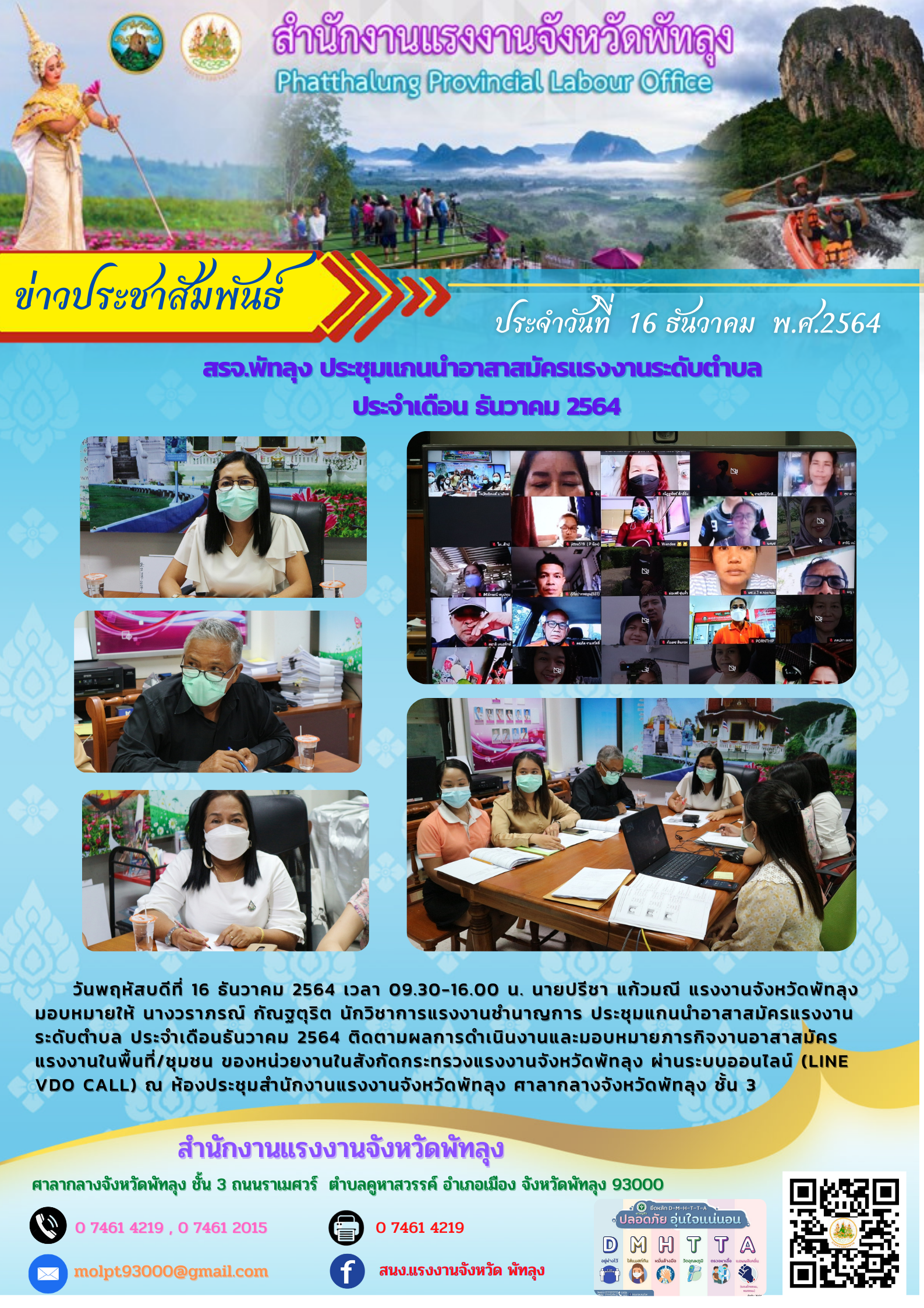 วันพฤหัสบดีที่ 16 ธันวาคม 2564 เวลา 09.30-16.00 น. นายปรีชา แก้วมณี แรงงานจังหวัดพัทลุงมอบหมายให้ นางวราภรณ์ กัณฐตุริต นักวิชาการแรงงานชำนาญการ ประชุมแกนนำอาสาสมัครแรงงานระดับตำบล ประจำเดือนธันวาคม 2564 ติดตามผลการดำเนินงานและมอบหมายภารกิจงานอาสาสมัครแรงงานในพื้นที่/ชุมชน ของหน่วยงานในสังกัดกระทรวงแรงงานจังหวัดพัทลุง ผ่านระบบออนไลน์ (LINE vdo cALL) ณ ห้องประชุมสำนักงานแรงงานจังหวัดพัทลุง ศาลากลางจังหวัดพัทลุง ชั้น 3