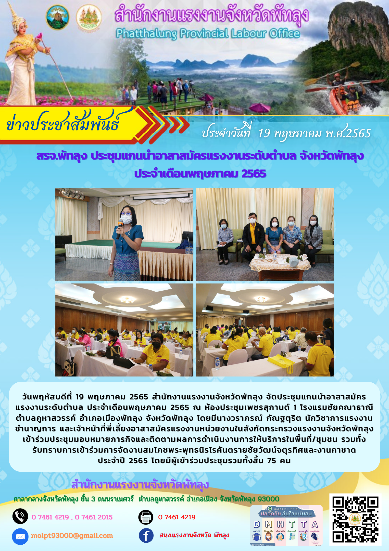 วันพฤหัสบดีที่ 19 พฤษภาคม 2565 สำนักงานแรงงานจังหวัดพัทลุง จัดประชุมแกนนำอาสาสมัครแรงงานระดับตำบล ประจำเดือนพฤษภาคม 2565 ณ ห้องประชุมเพชรสุกานต์ 1 โรงแรมชัยคณาธาณี ตำบลคูหาสวรรค์ อำเภอเมืองพัทลุง จังหวัดพัทลุง โดยมีนางวราภรณ์ กัณฐตุริต นักวิชาการแรงงานชำนาญการ และเจ้าหน้าที่พี่เลี้ยงอาสาสมัครแรงงานหน่วยงานในสังกัดกระทรวงแรงงานจังหวัดพัทลุง เข้าร่วมประชุมมอบหมายภารกิจและติดตามผลการดำเนินงานการให้บริการในพื้นที่/ชุมชน รวมทั้งรับทราบการเข้าร่วมการจัดงานสมโภชพระพุทธนิรโรคันตรายชัยวัฒน์จตุรทิศและงานกาชาดประจำปี 2565 โดยมีผู้เข้าร่วมประชุมรวมทั้งสิ้น 75 คน