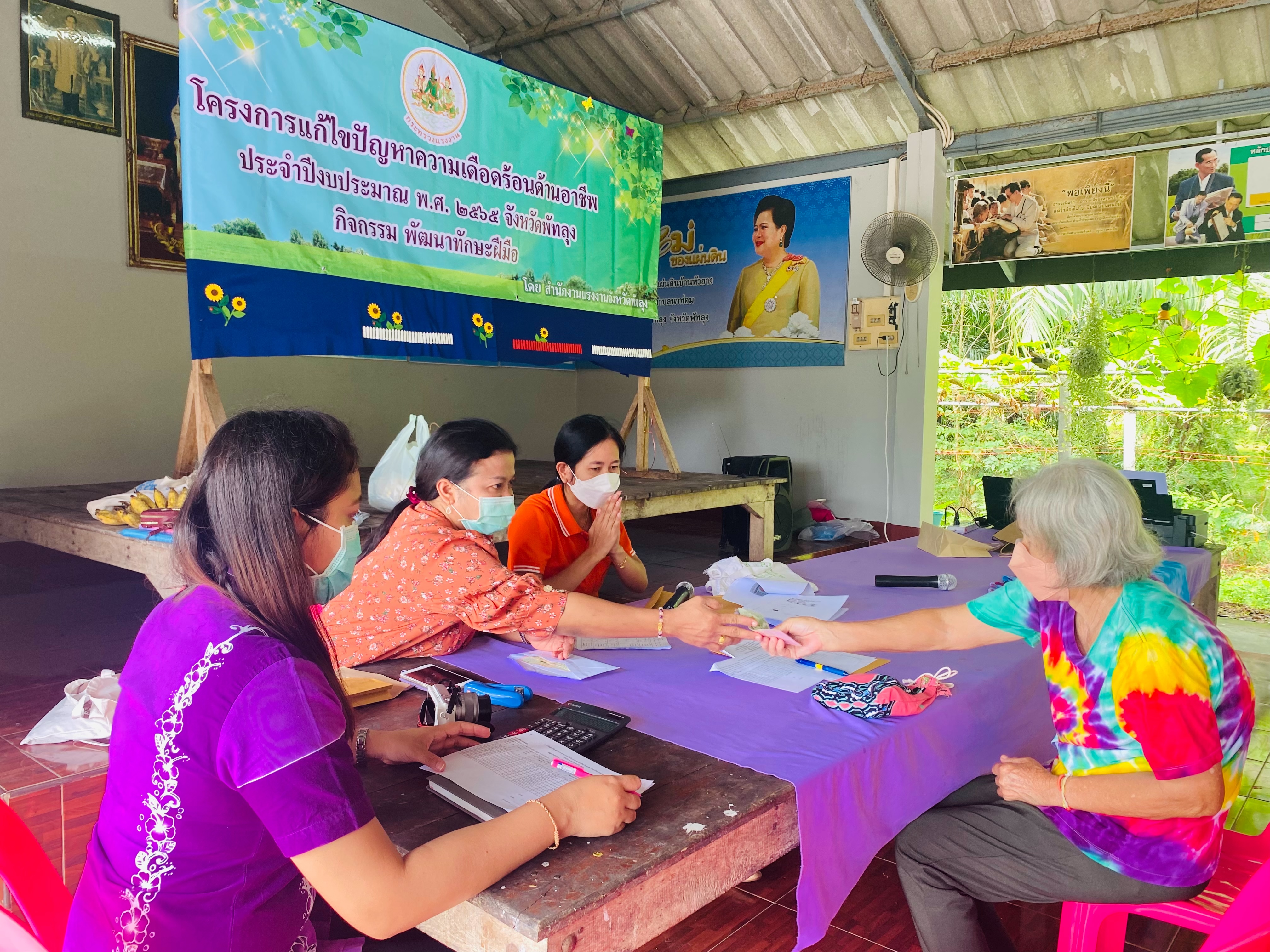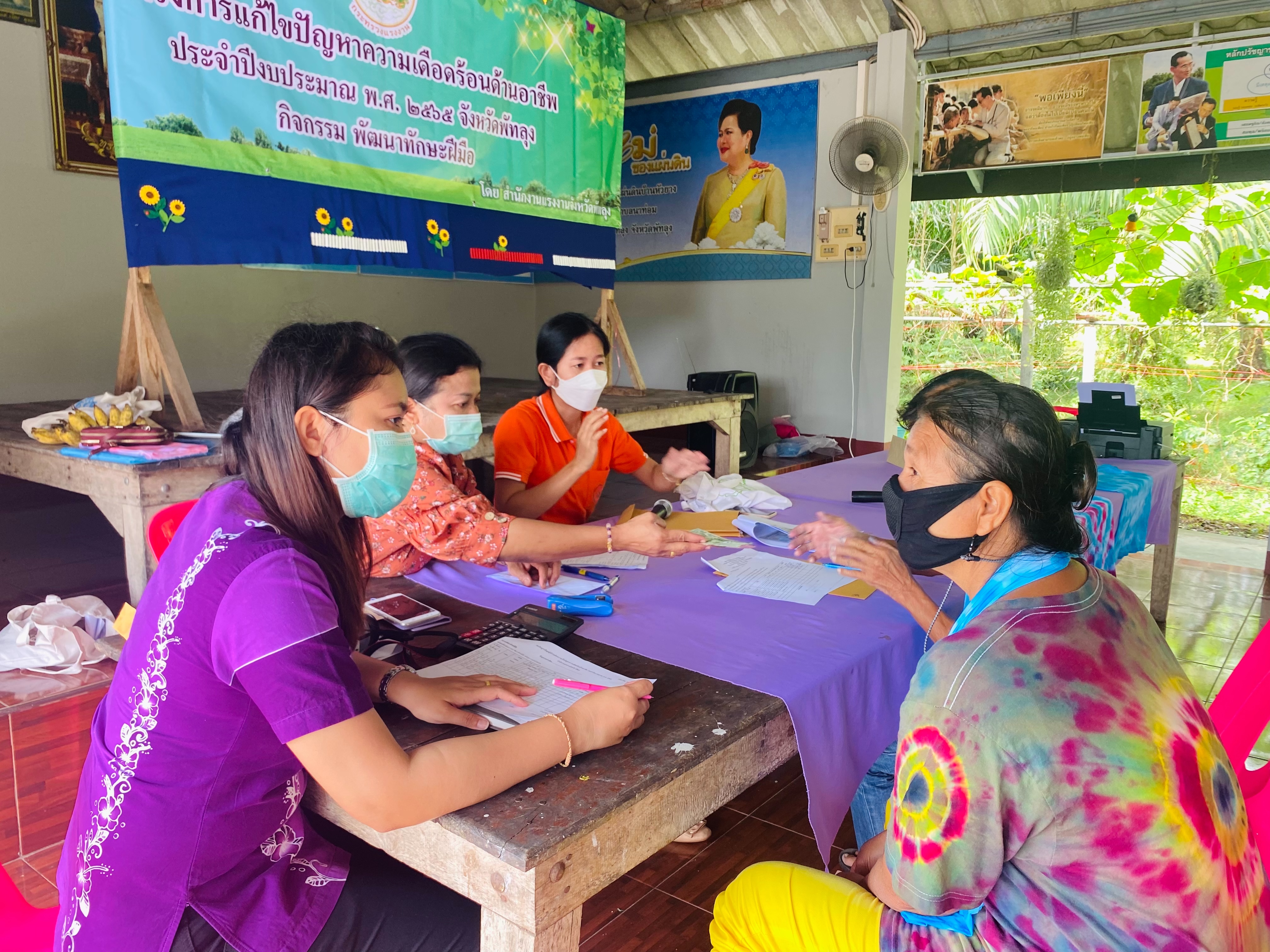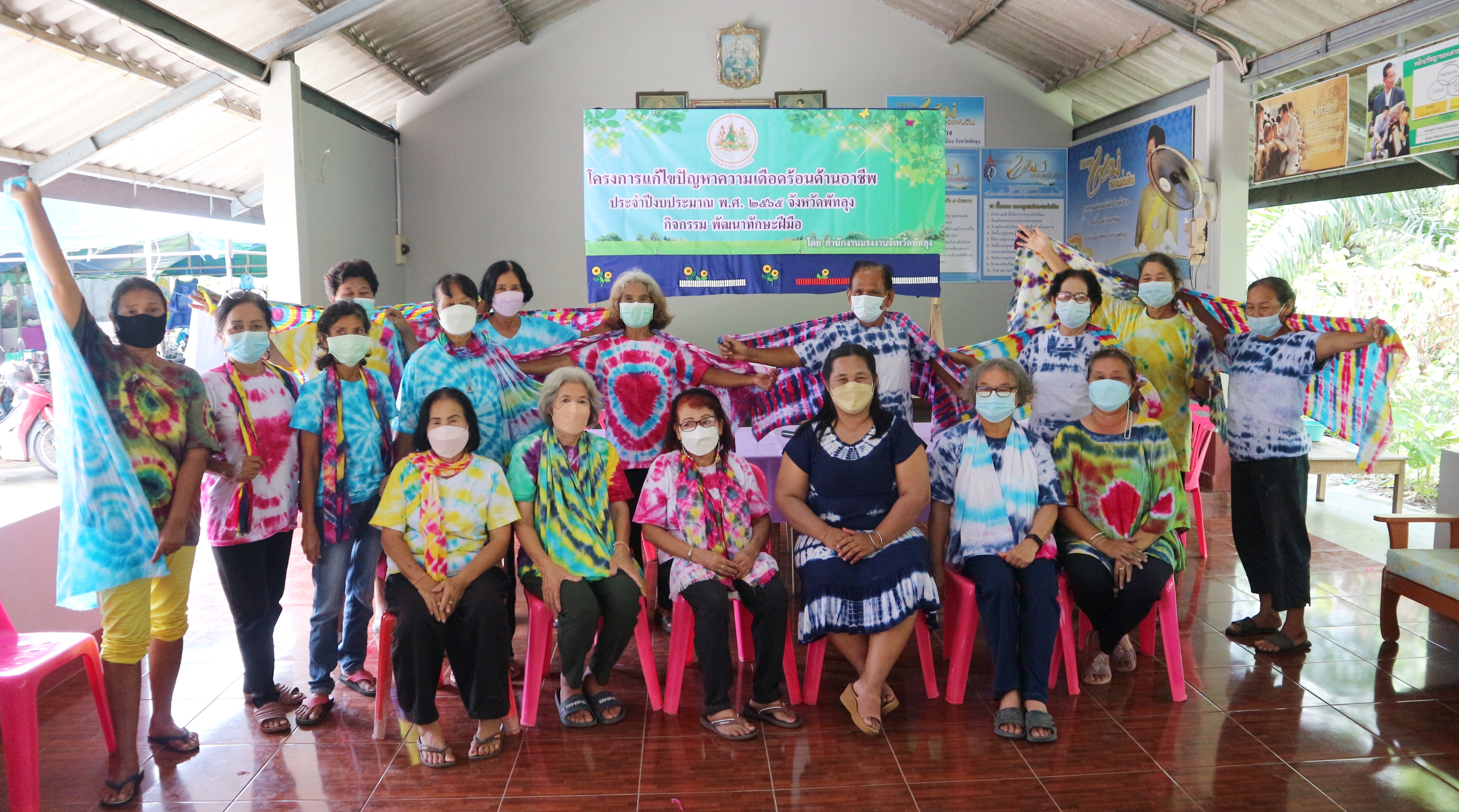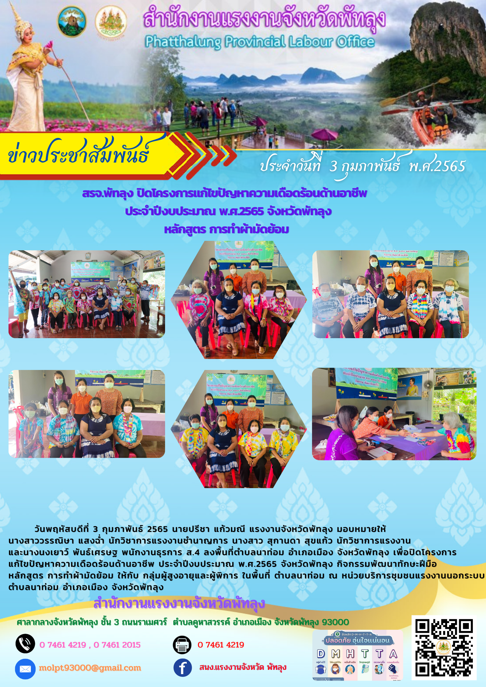 วันพฤหัสบดีที่ 3 กุมภาพันธ์ 2565 นายปรีชา แก้วมณี แรงงานจังหวัดพัทลุง มอบหมายให้นางสาววรรณิษา แสงฉ่ำ นักวิชาการแรงงานชำนาญการ นางสาว สุกานดา สุขแก้ว นักวิชาการแรงงานและนางนงเยาว์ พันธ์เศรษฐ พนักงานธุรการ ส.4 ลงพื้นที่ตำบลนาท่อม อำเภอเมือง จังหวัดพัทลุง เพื่อปิดโครงการ แก้ไขปัญหาความเดือดร้อนด้านอาชีพ ประจำปีงบประมาณ พ.ศ.2565 จังหวัดพัทลุง กิจกรรมพัฒนาทักษะฝีมือ หลักสูตร การทำผ้ามัดย้อม ให้กับ กลุ่มผู้สูงอายุและผู้พิการ ในพื้นที่ ตำบลนาท่อม ณ หน่วยบริการชุมชนแรงงานนอกระบบ ตำบลนาท่อม อำเภอเมือง จังหวัดพัทลุง